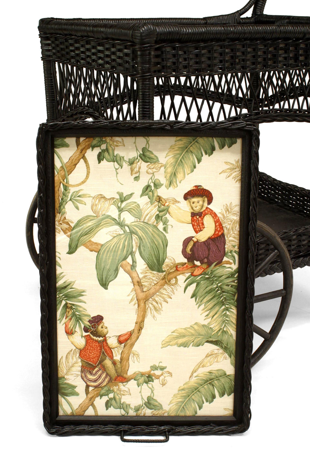 American Victorian black painted wicker bar cart with 2 large front wheels supporting a shelf with gallery and a tray top with handles above a woven apron.