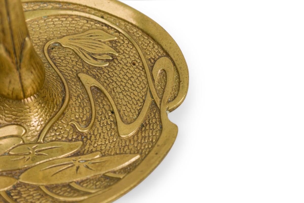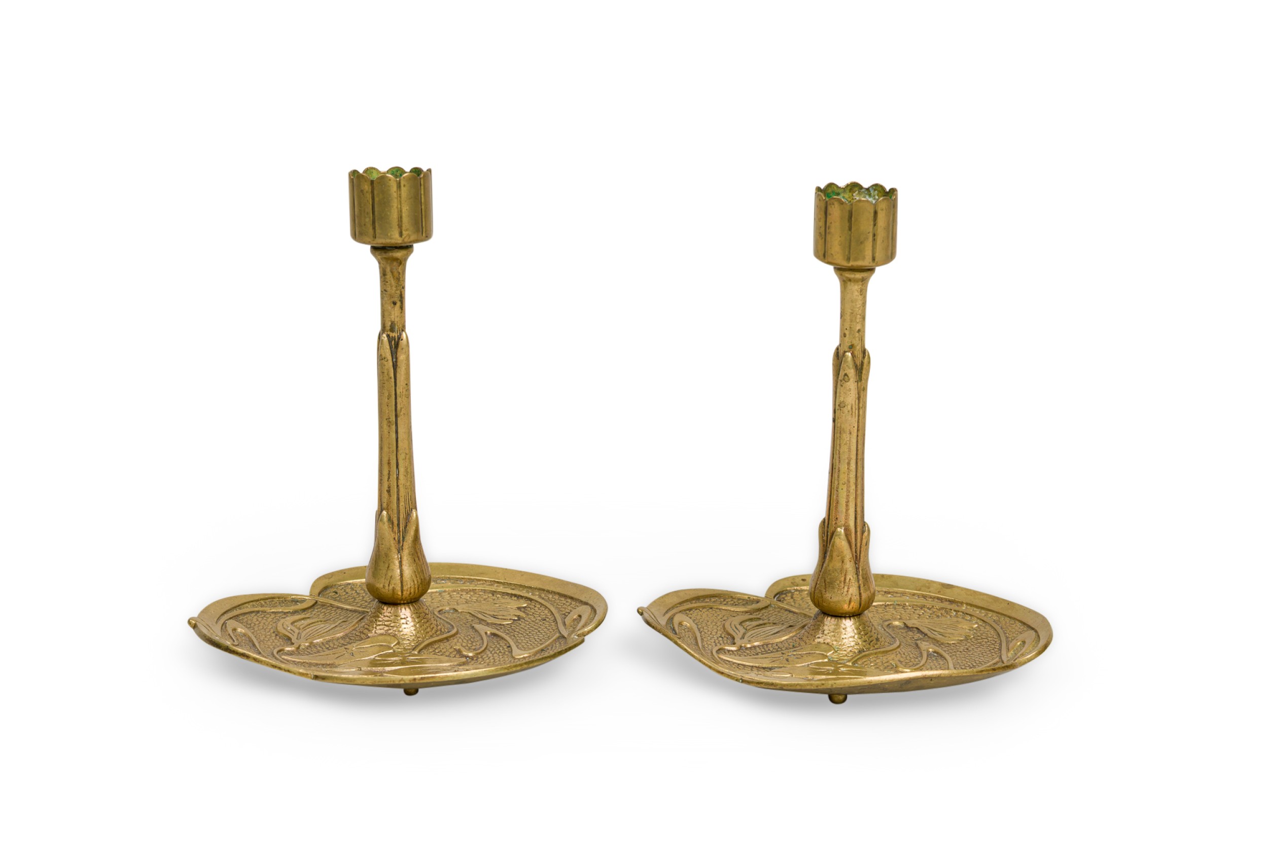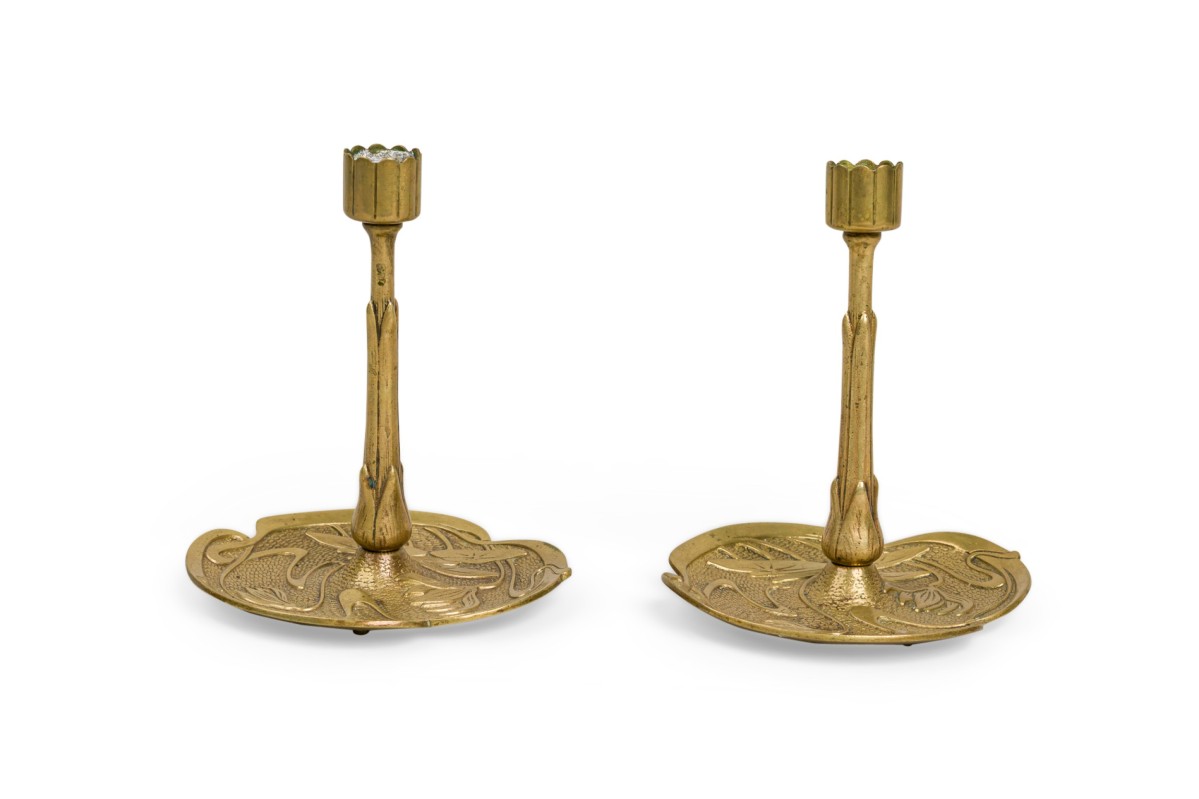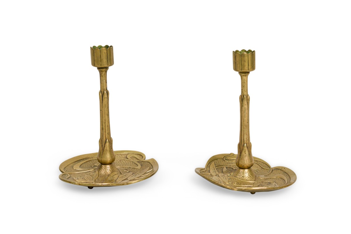 PAIR of Austrian Art Nouveau / Secessionist bronze candlesticks with the relief of whiplash stems emerging from the bobeches upright cradling a candle stick with two lilies (marked: GESCHUTZT) (PRICED AS PAIR)