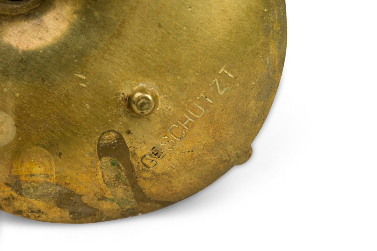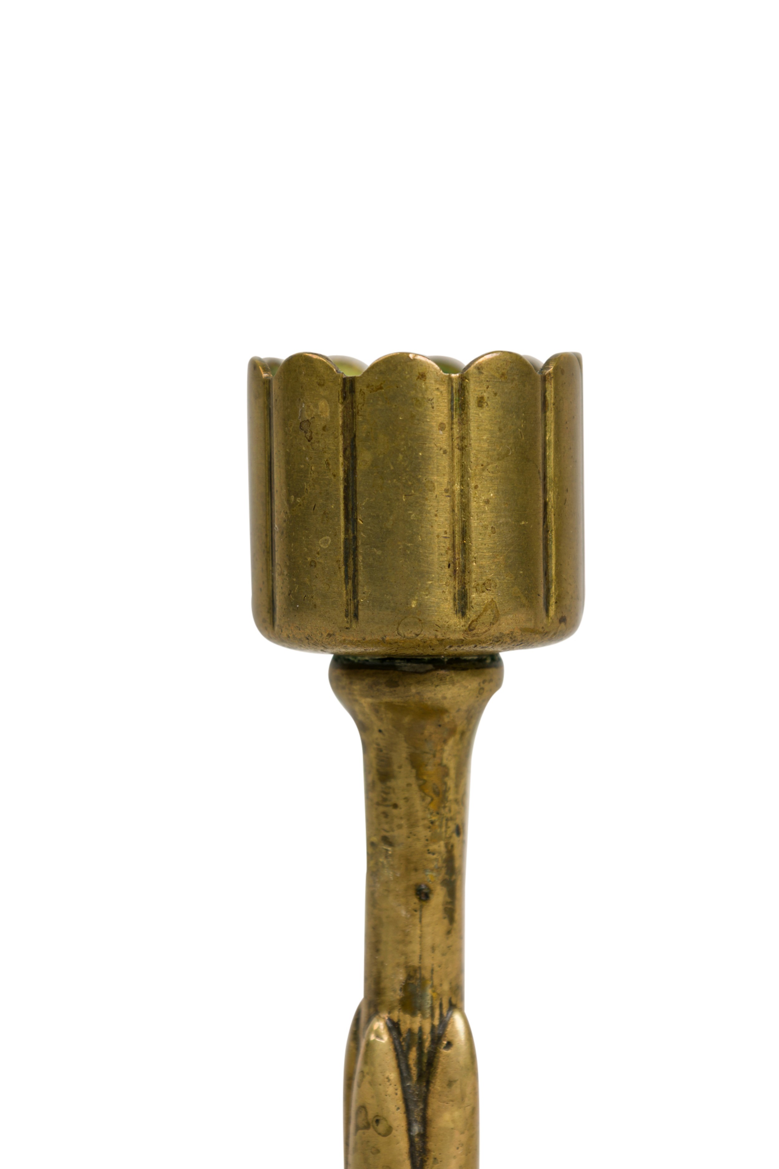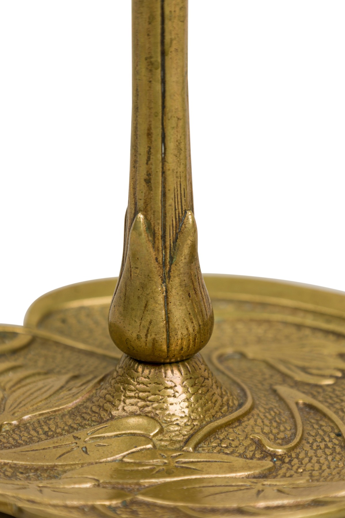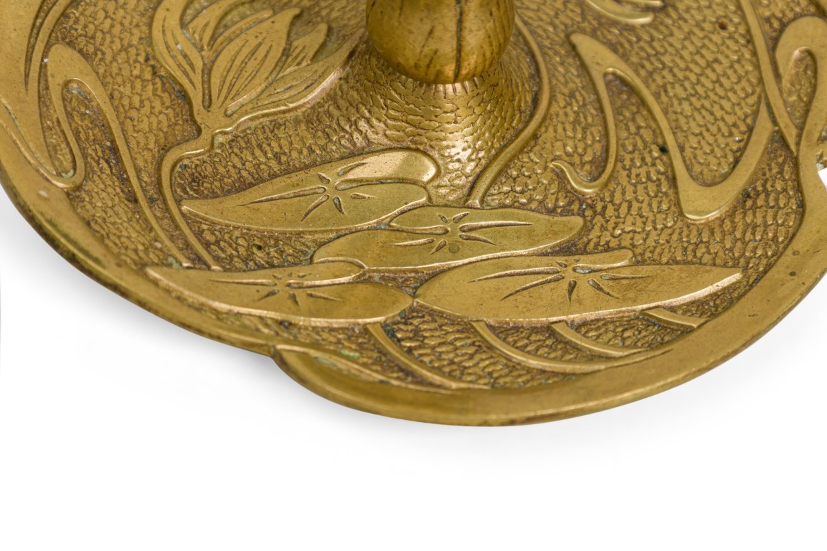 PAIR of Austrian Art Nouveau / Secessionist bronze candlesticks with the relief of whiplash stems emerging from the bobeches upright cradling a candle stick with two lilies (marked: GESCHUTZT) (PRICED AS PAIR)