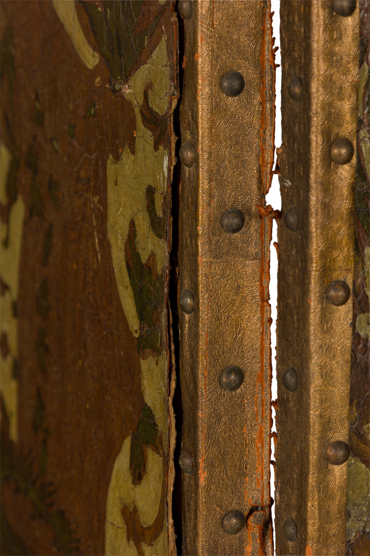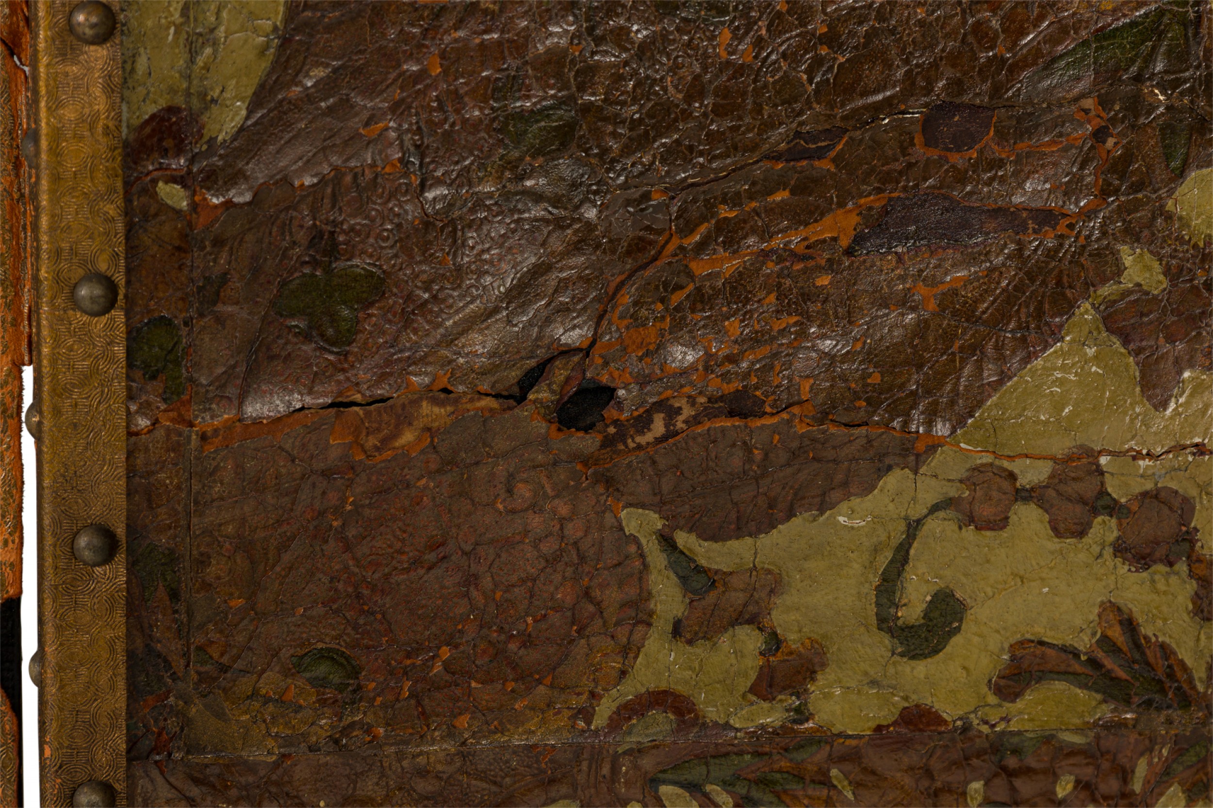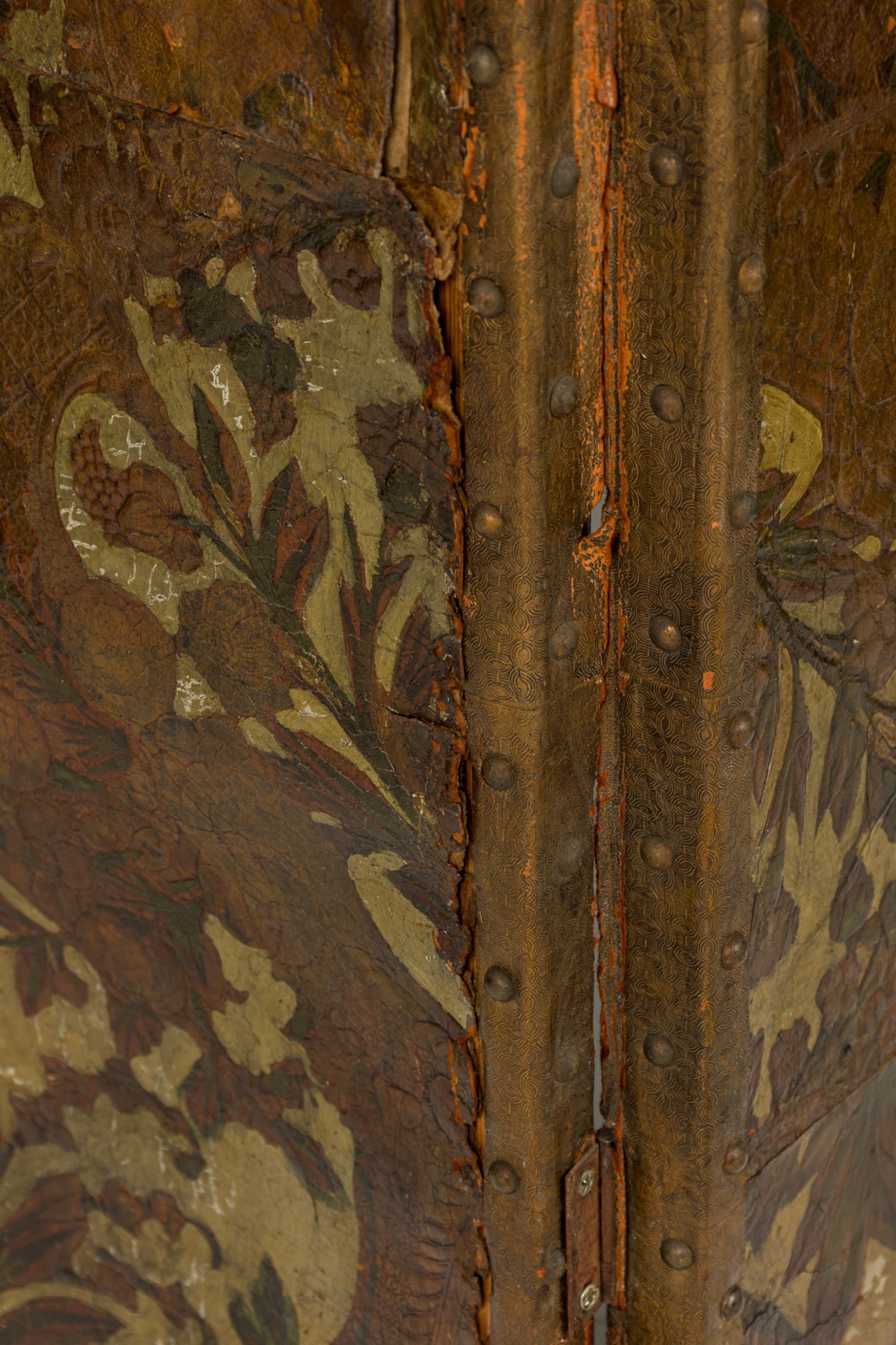 Italian 4-panel folding screen with brown and beige tooled leather panels featuring detailed floral designs, with brass nailhead trim and a black canvas-faced reverse.