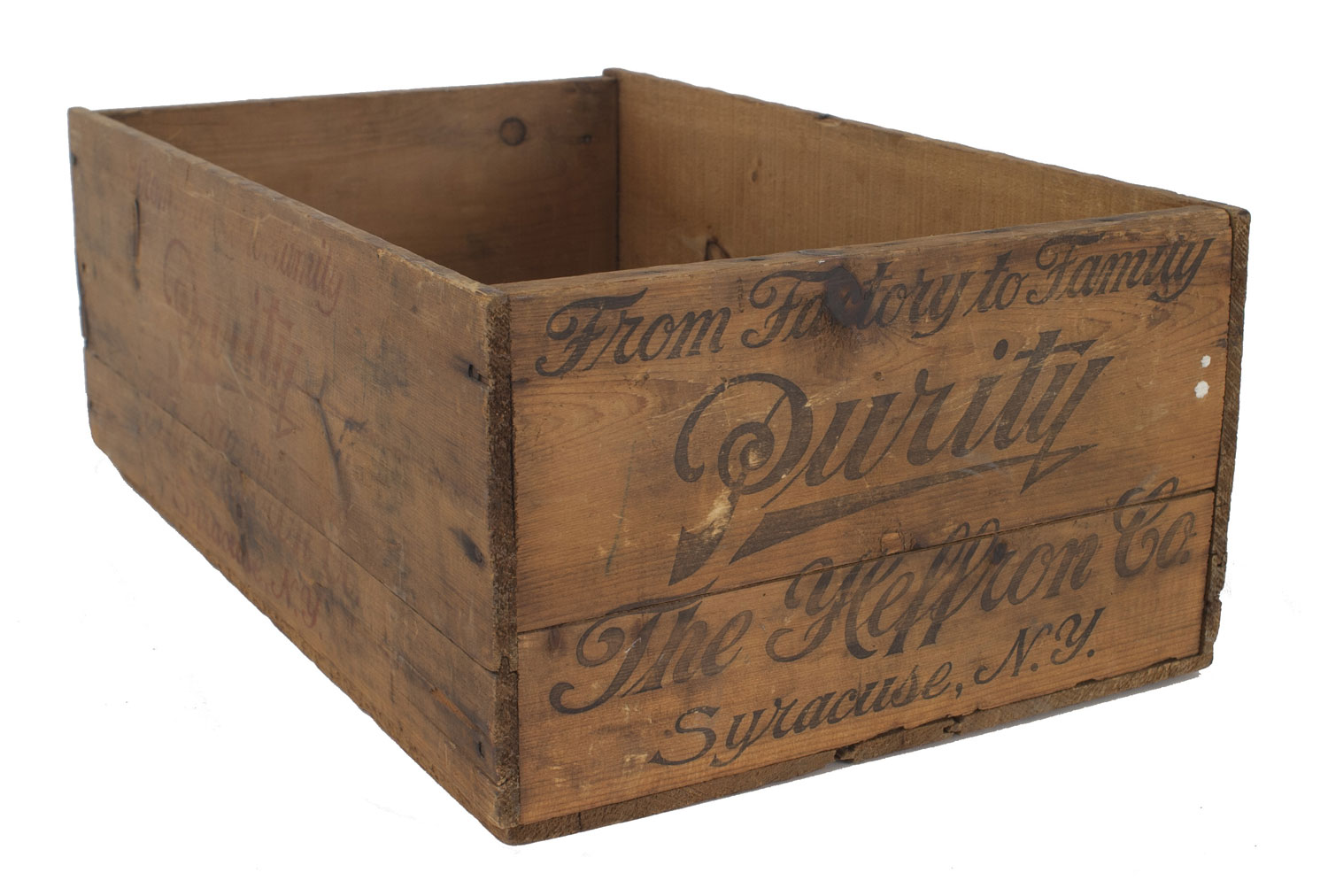 Antique wooden crate with cursive writing on the sides reading " From Factory to Family, Purity, Syracuse NY"