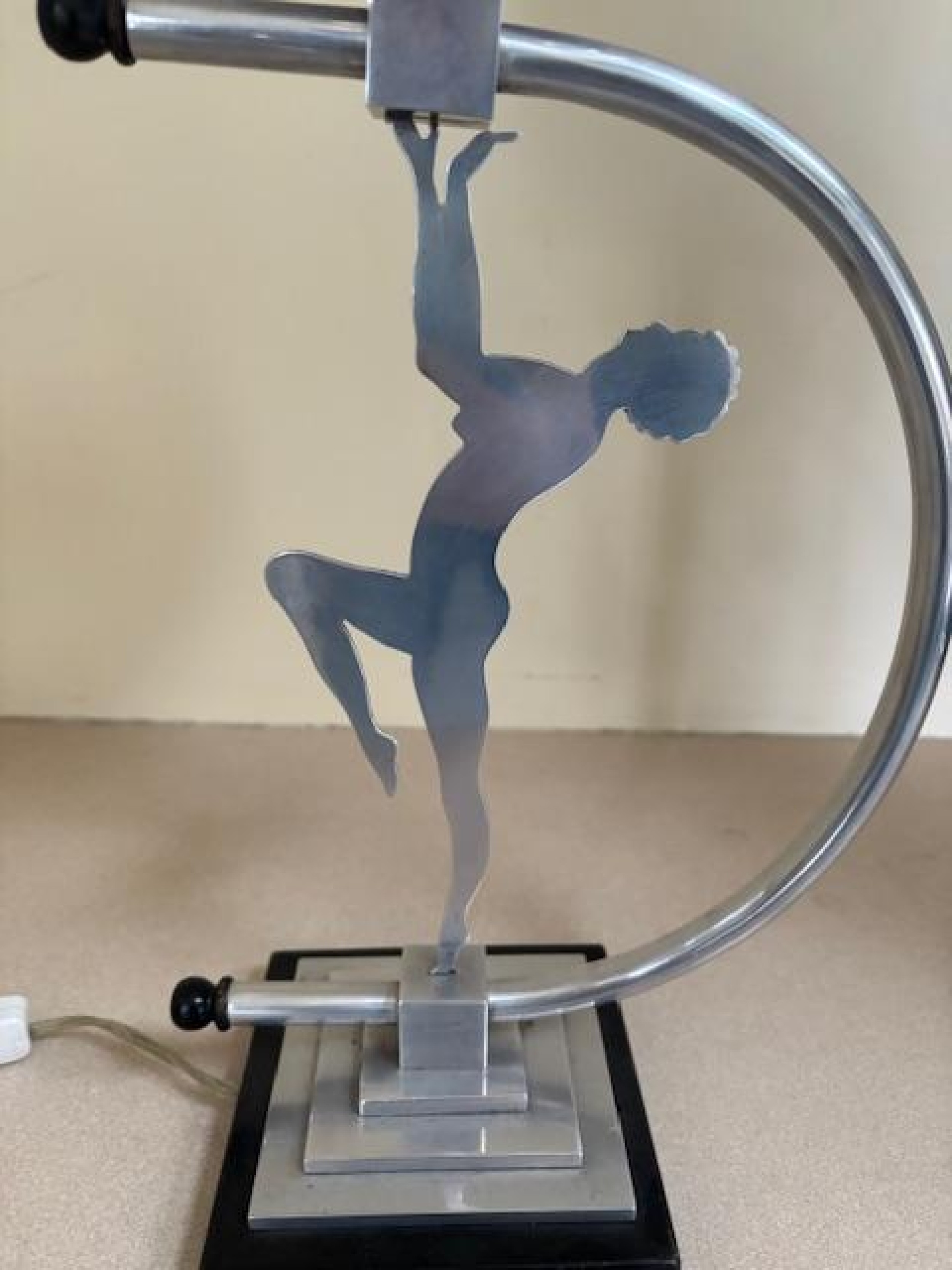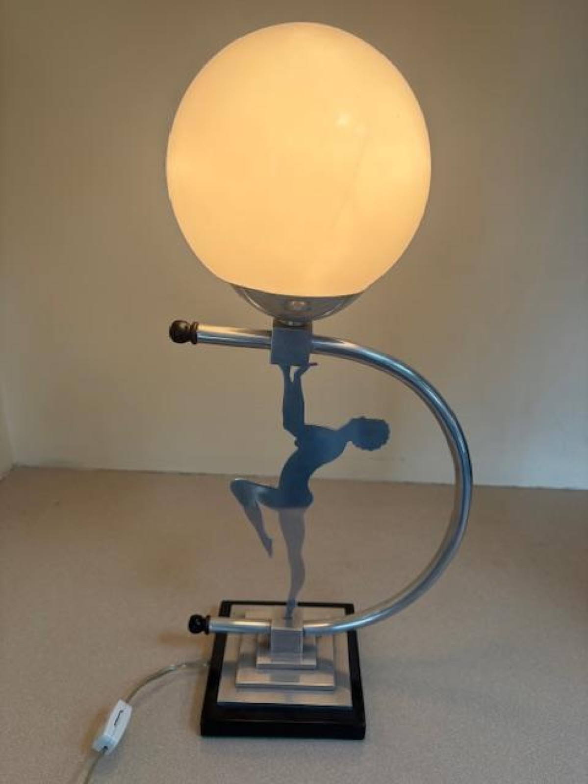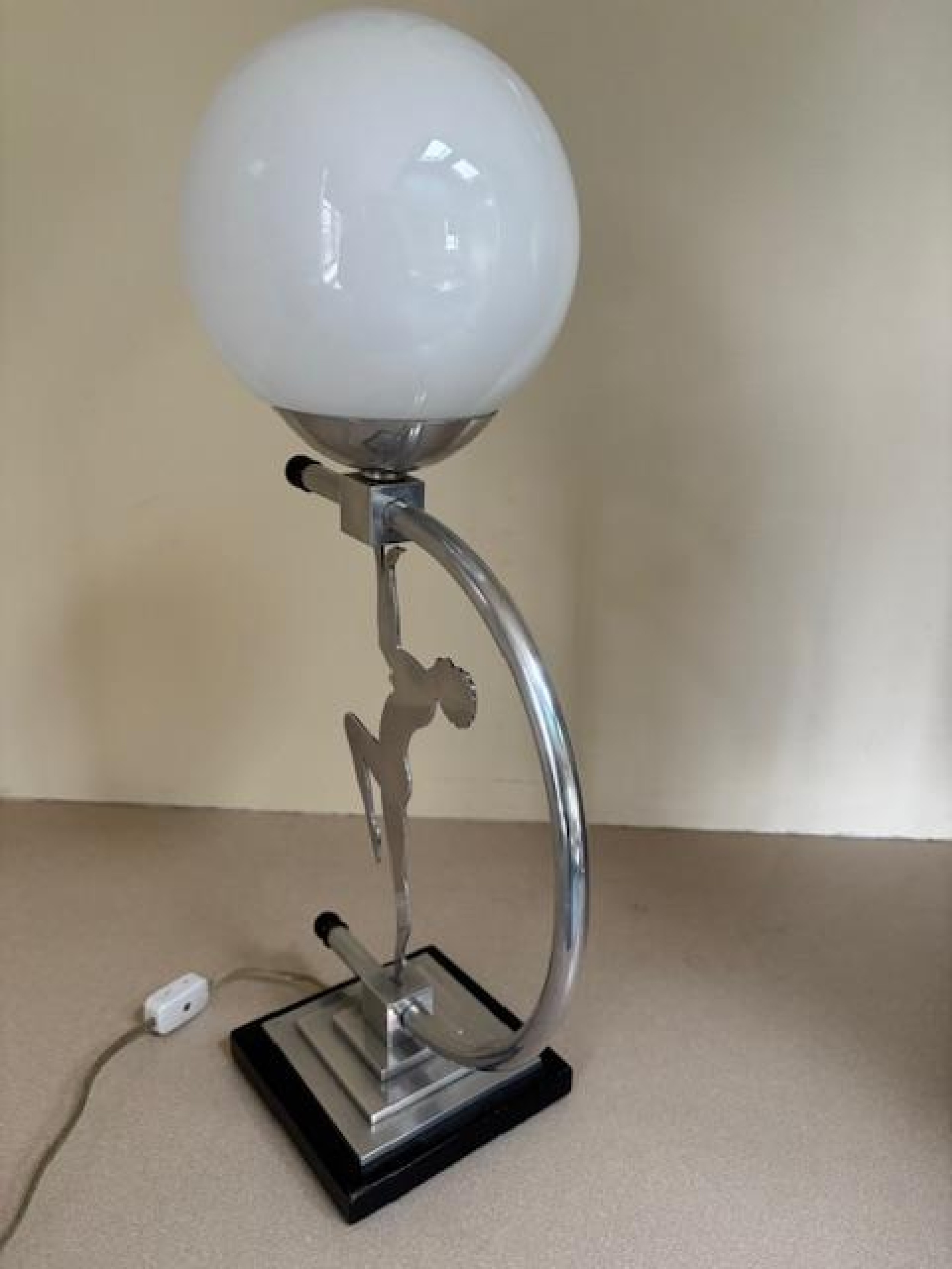 Art Deco Chome lamp with a lady supporting a white glass globe