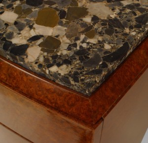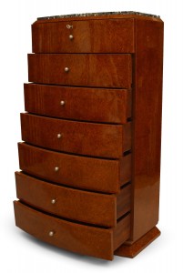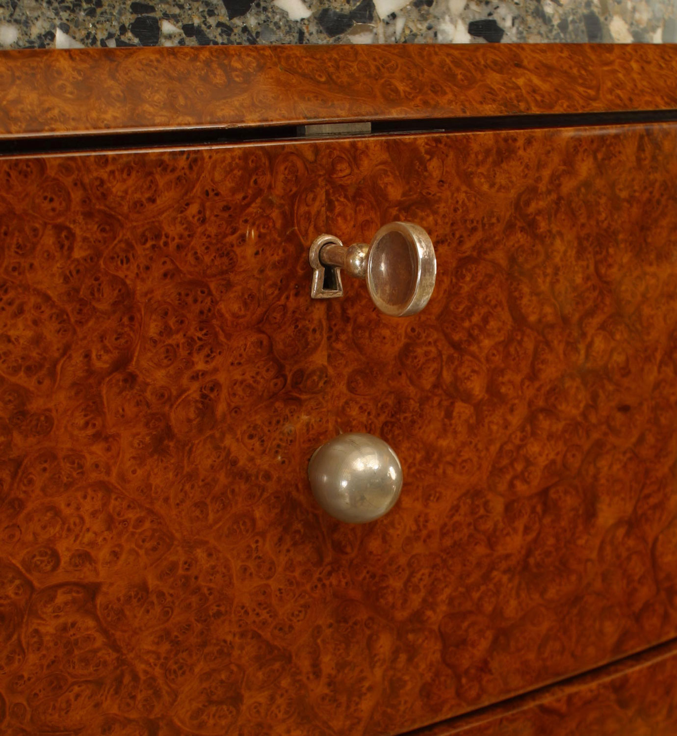 Art Deco French amboyna semaniere with slight bow front and inset marble top with nickled brass pulls & original key (signed: KRIEGER on the back & lock)