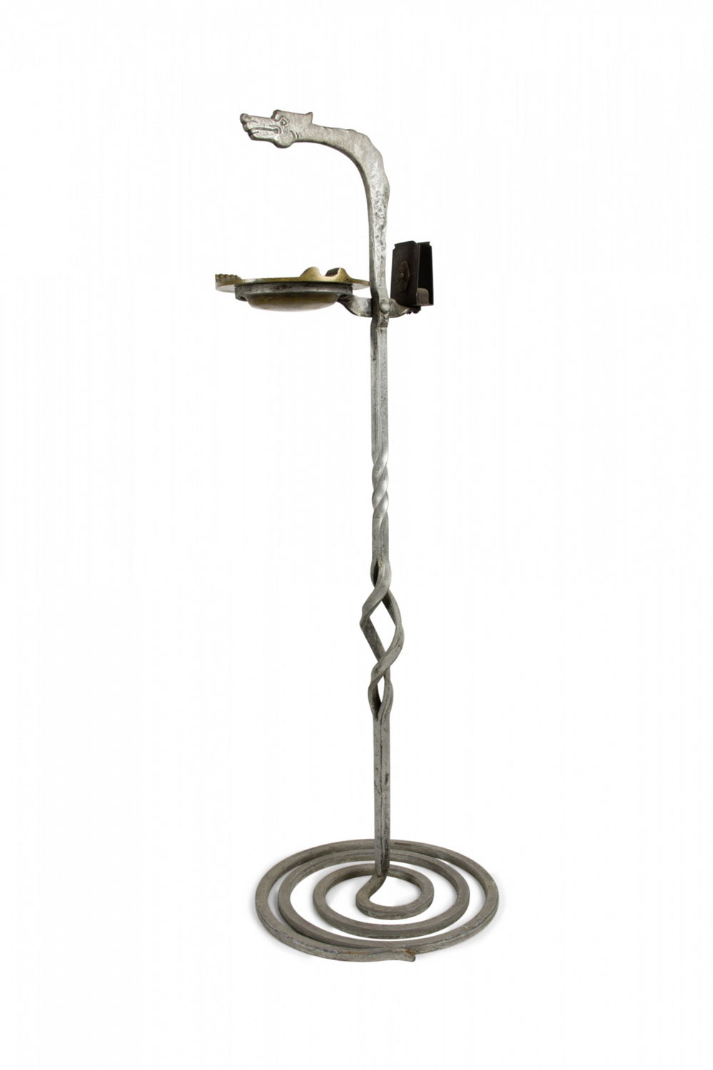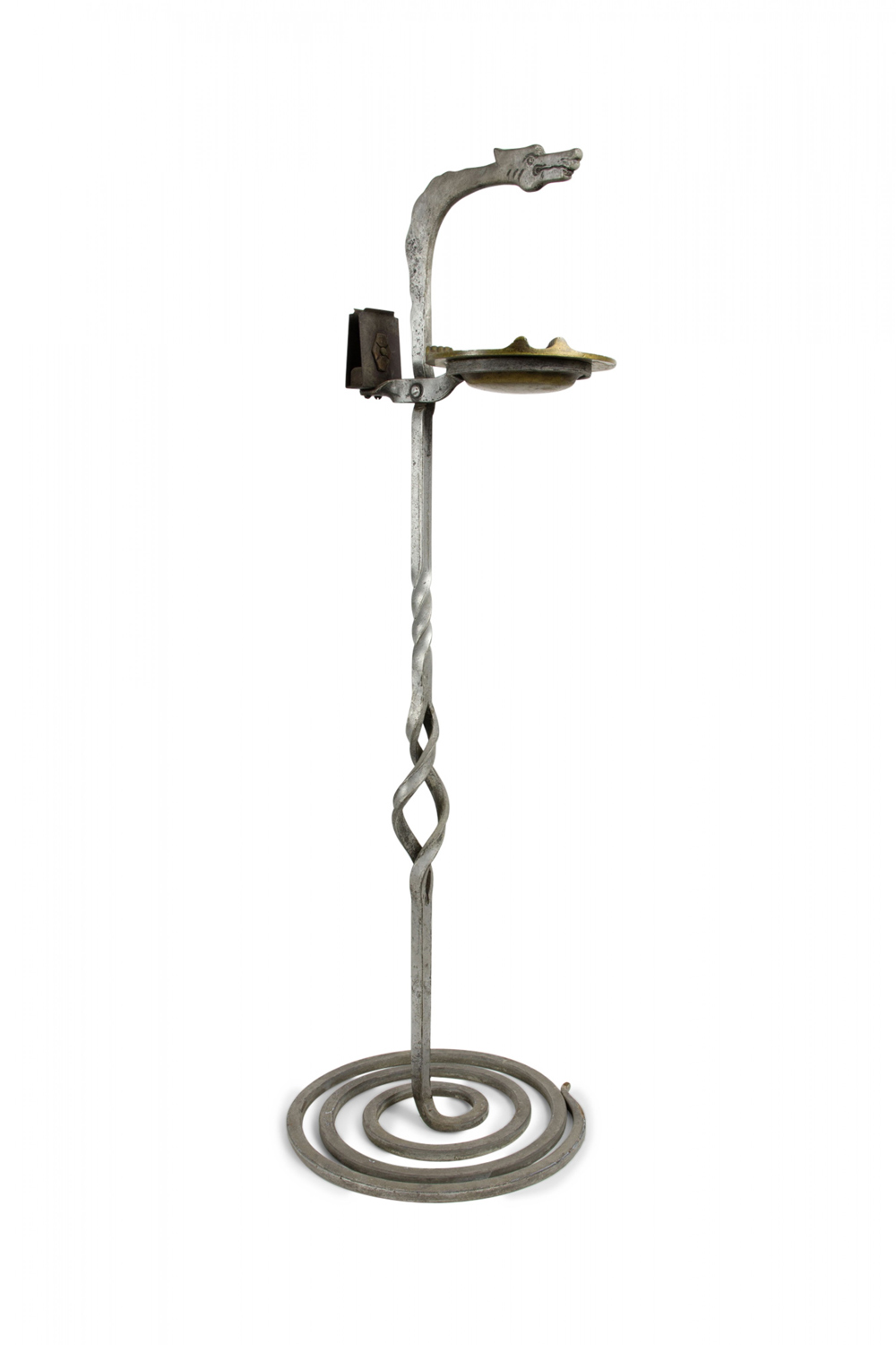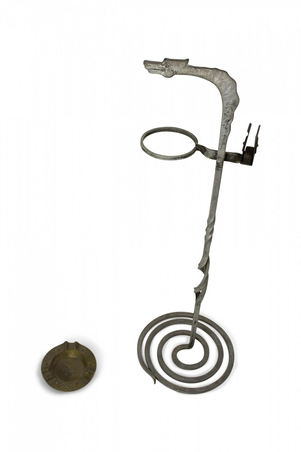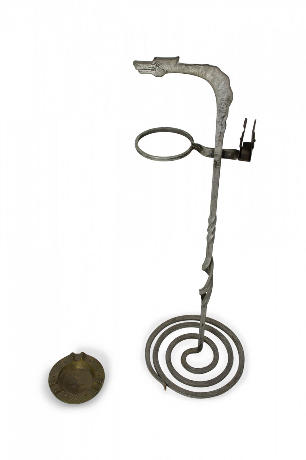 American Art Deco Gothic wrought iron snake shaped smoking stand with coiled base and brass ashtray.