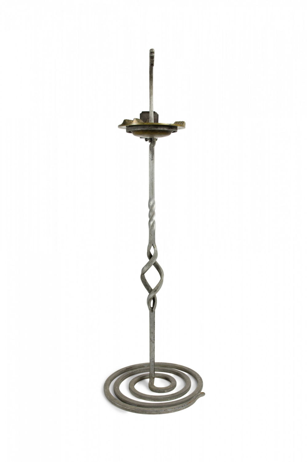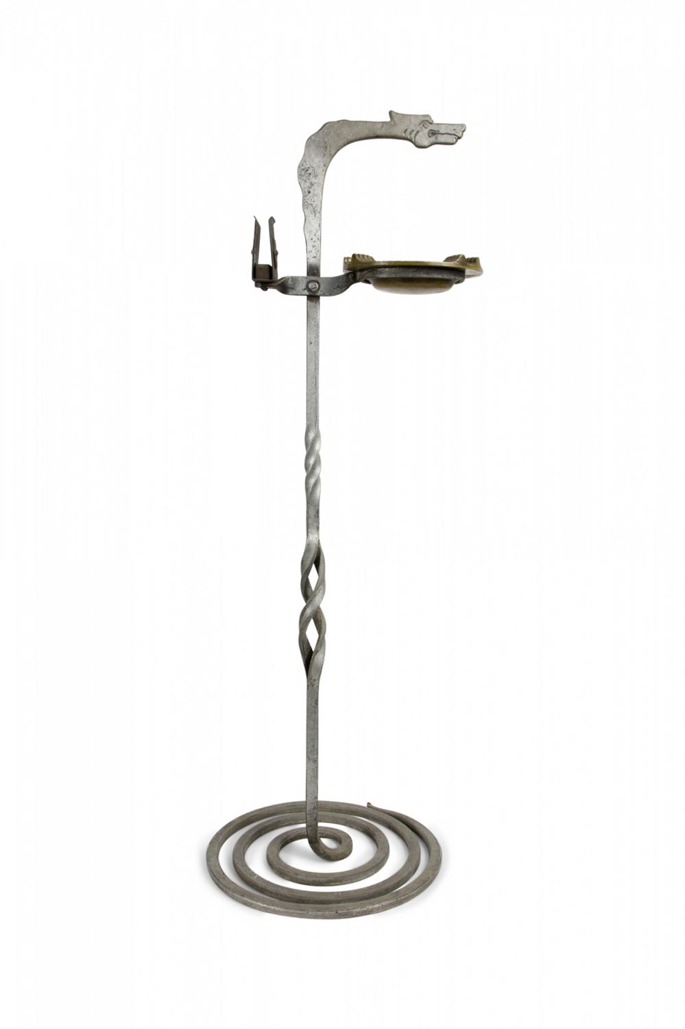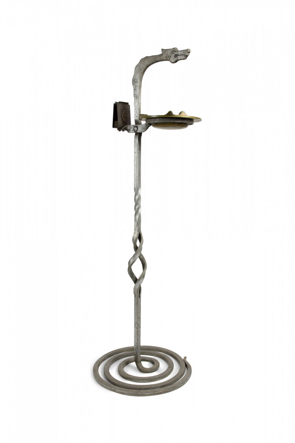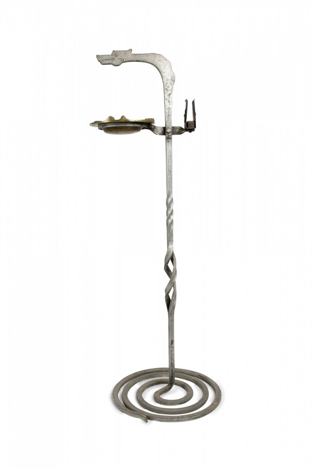 American Art Deco Gothic wrought iron snake shaped smoking stand with coiled base and brass ashtray.