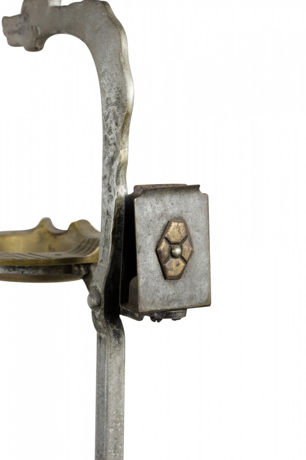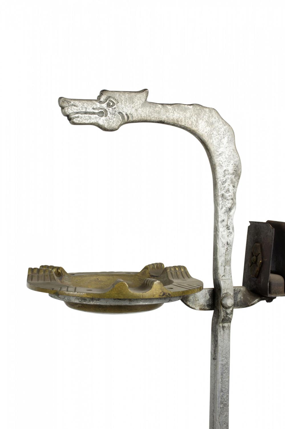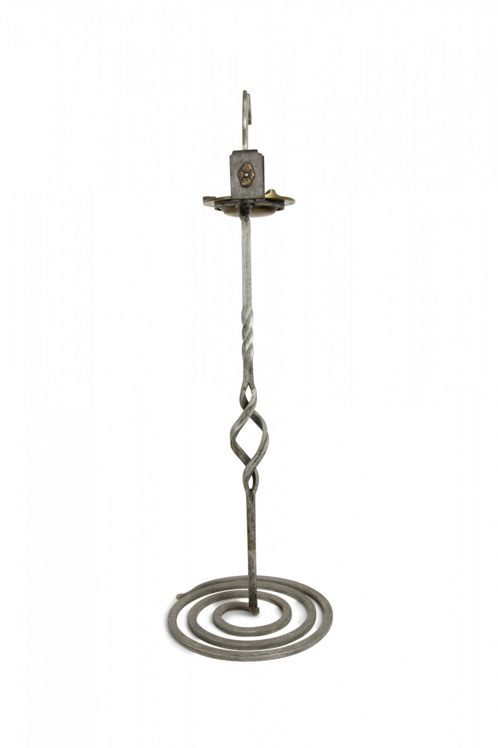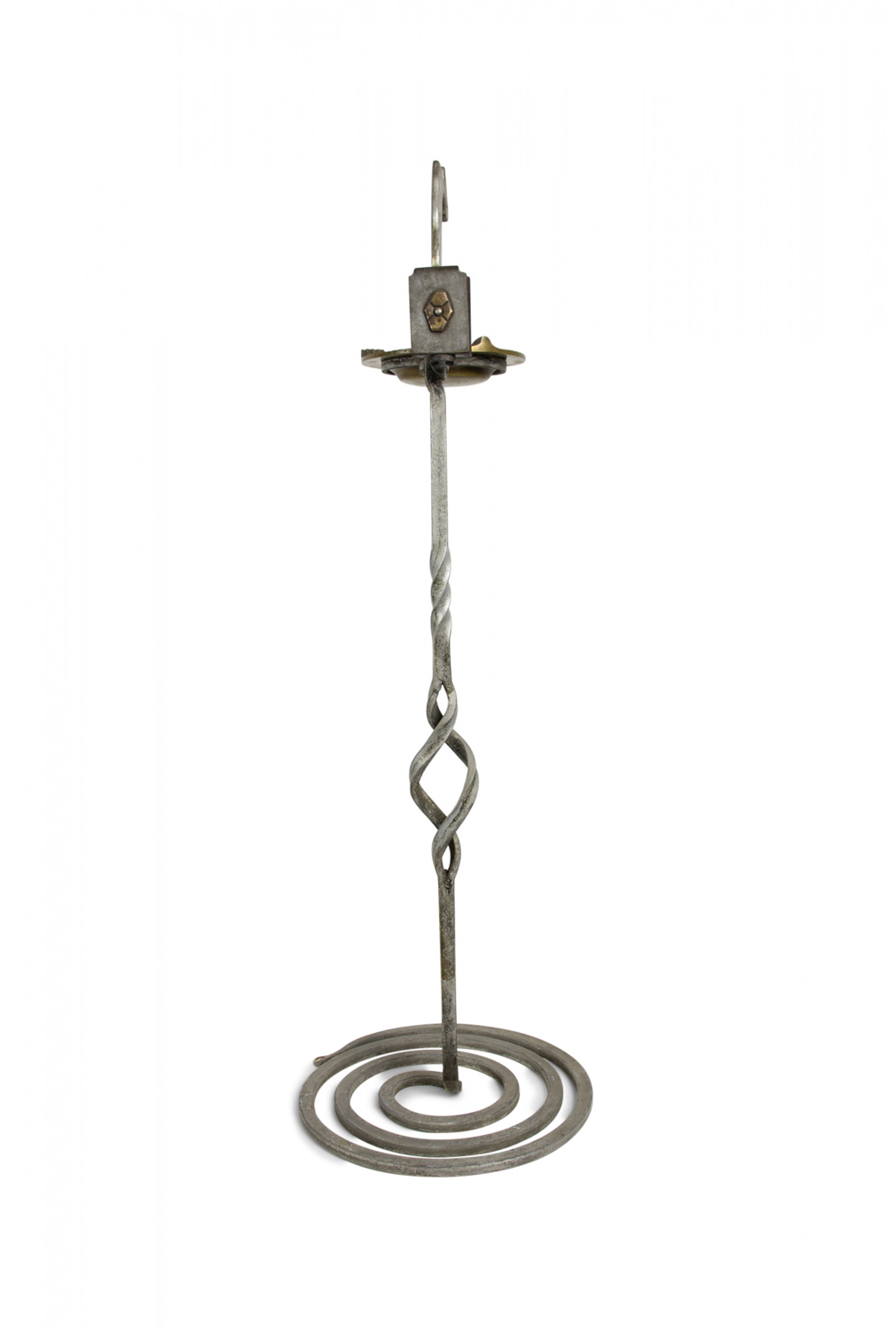 American Art Deco Gothic wrought iron snake shaped smoking stand with coiled base and brass ashtray.