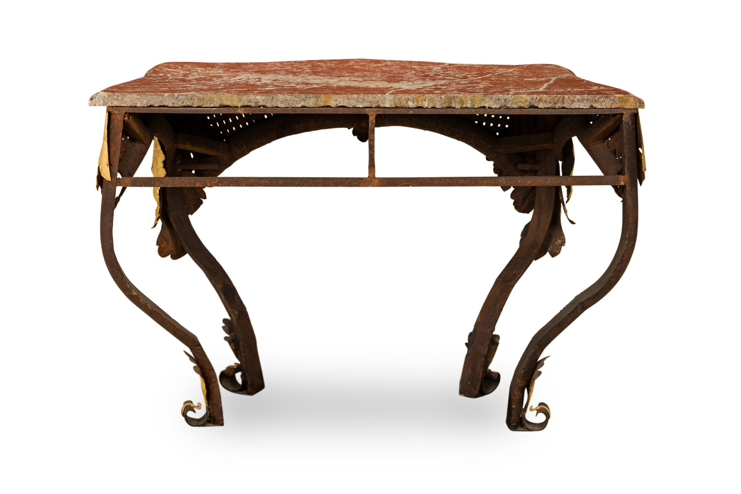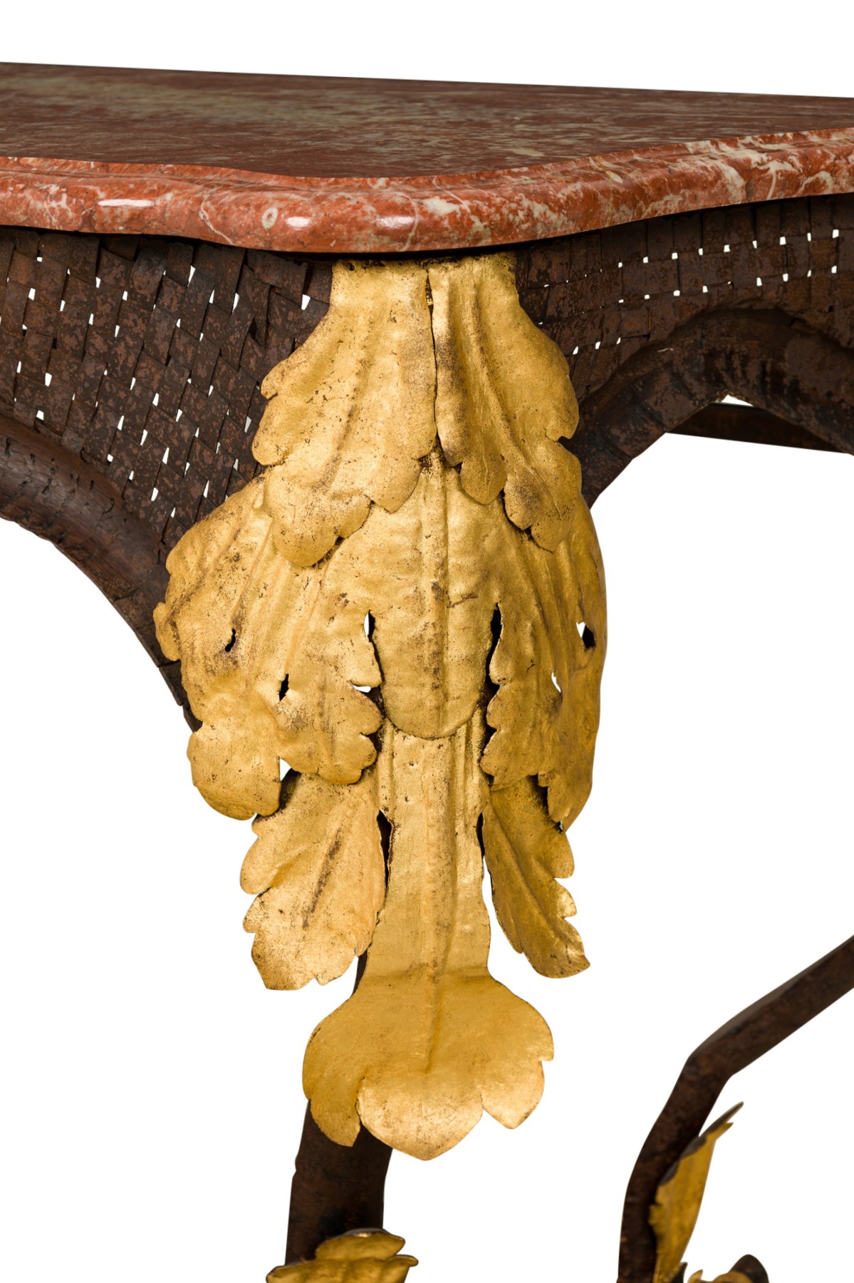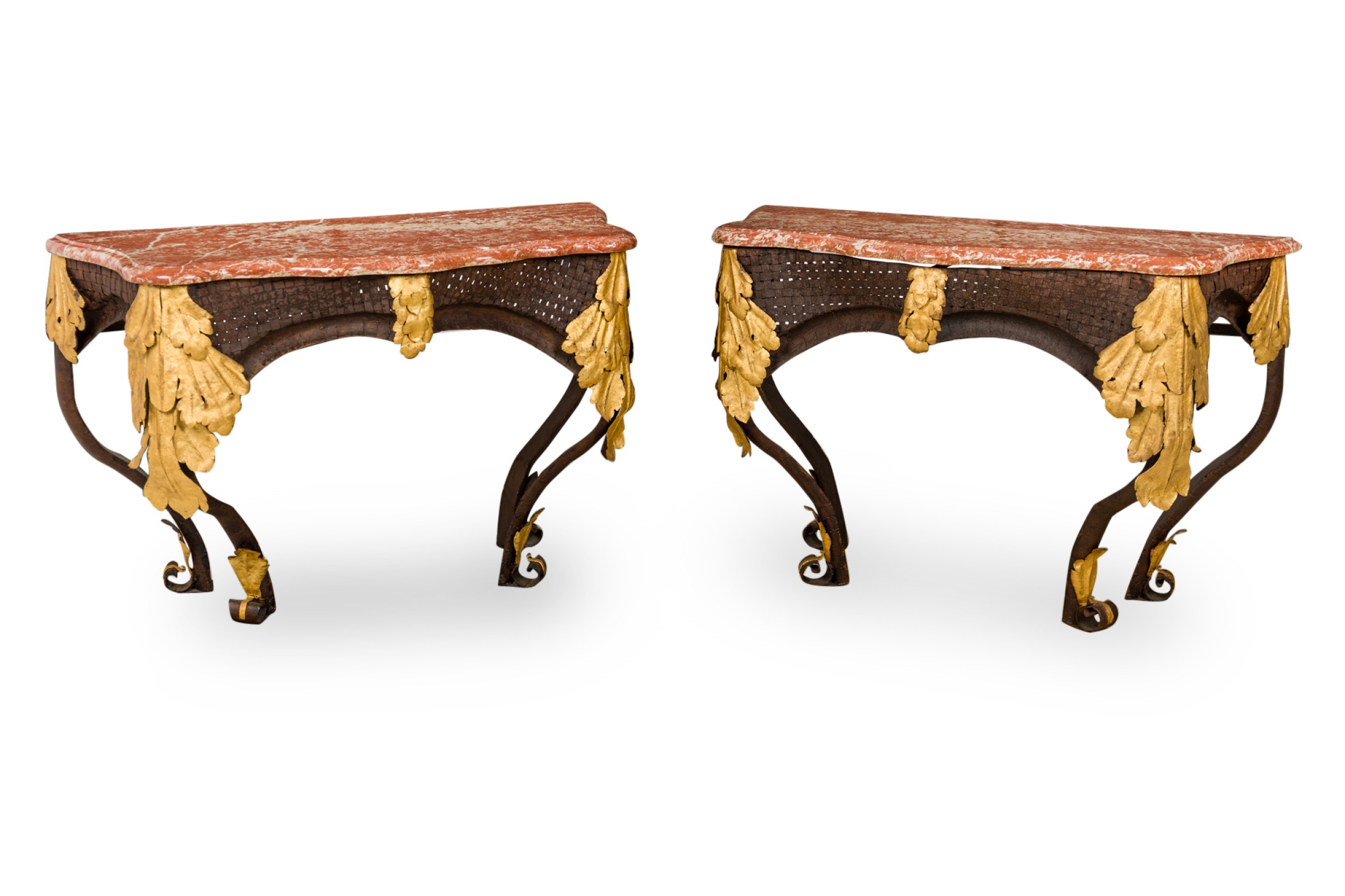 2 French Art Deco console tables with wrought iron frames featuring basket woven aprons resting on cabriole wrought iron legs, accented with gilt iron leaves and central medallions and topped with shaped blush marble tops. (PRICED EACH)