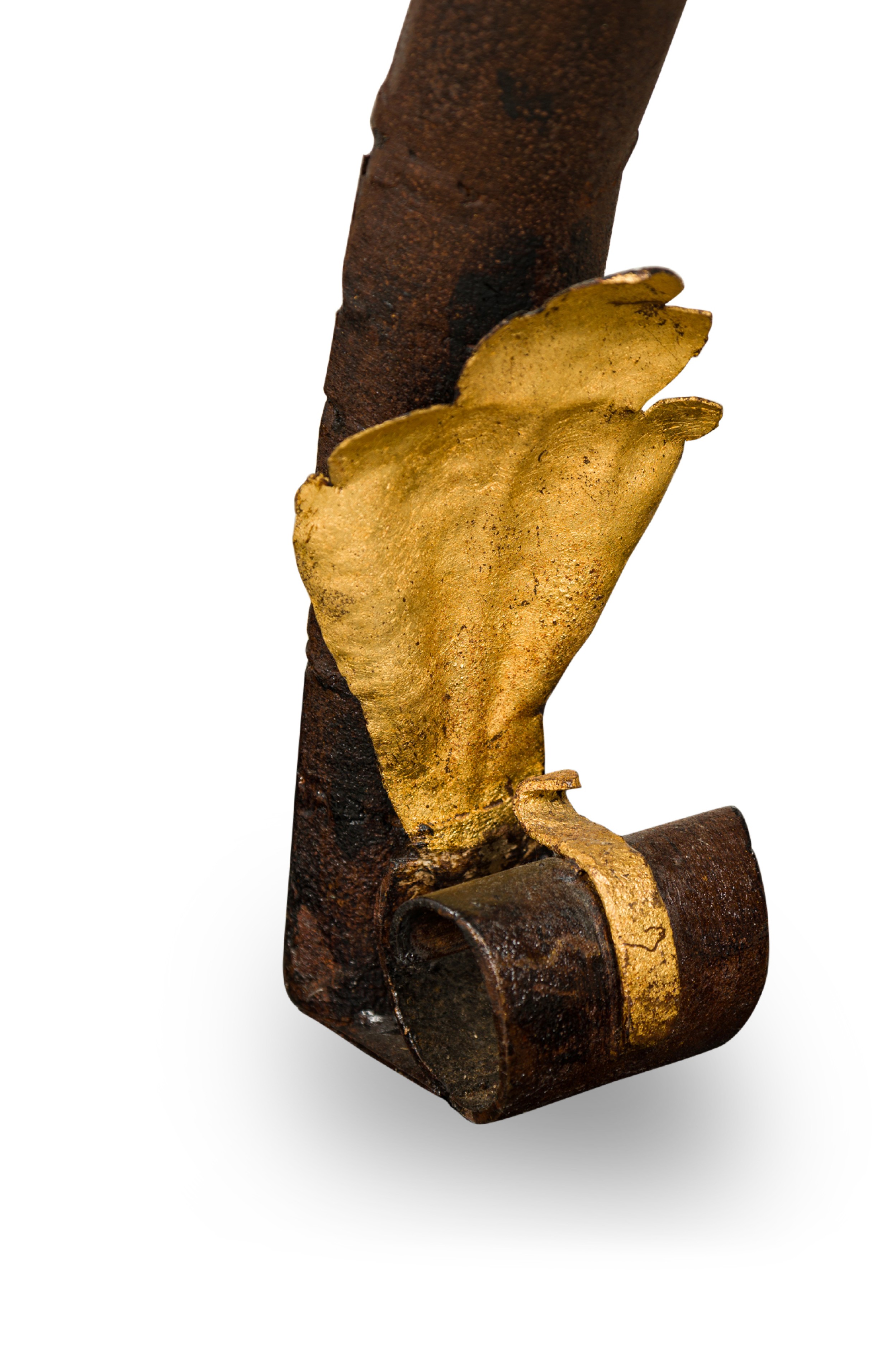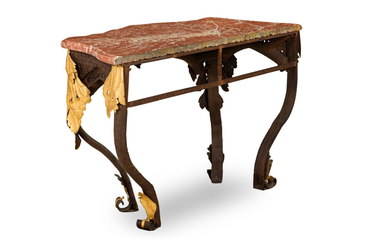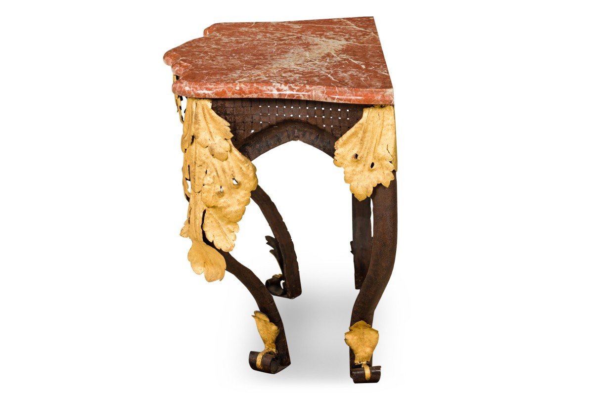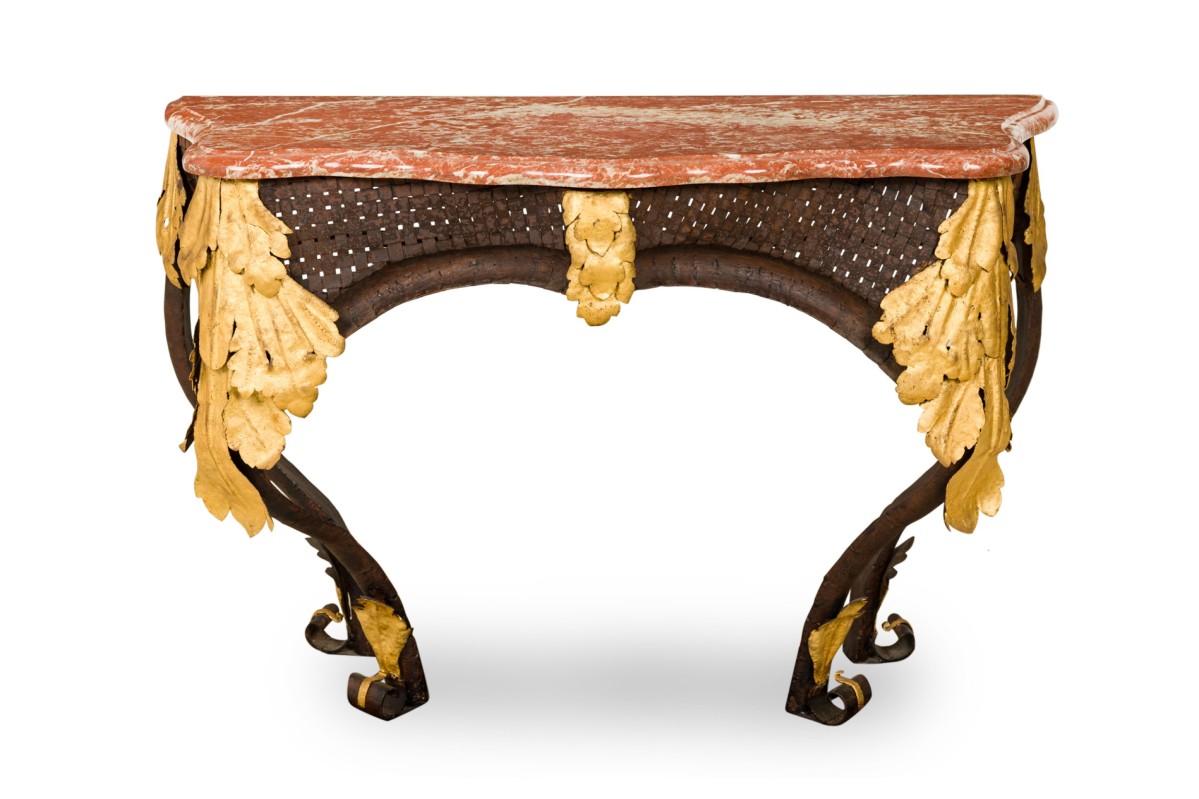 2 French Art Deco console tables with wrought iron frames featuring basket woven aprons resting on cabriole wrought iron legs, accented with gilt iron leaves and central medallions and topped with shaped blush marble tops. (PRICED EACH)