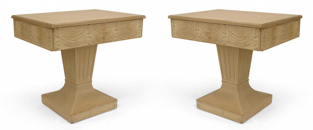 2 American Art Moderne bleached end tables with swag carved design on 3 sides and a drawer supported on a square fluted pedestal base. (PRICED EACH)