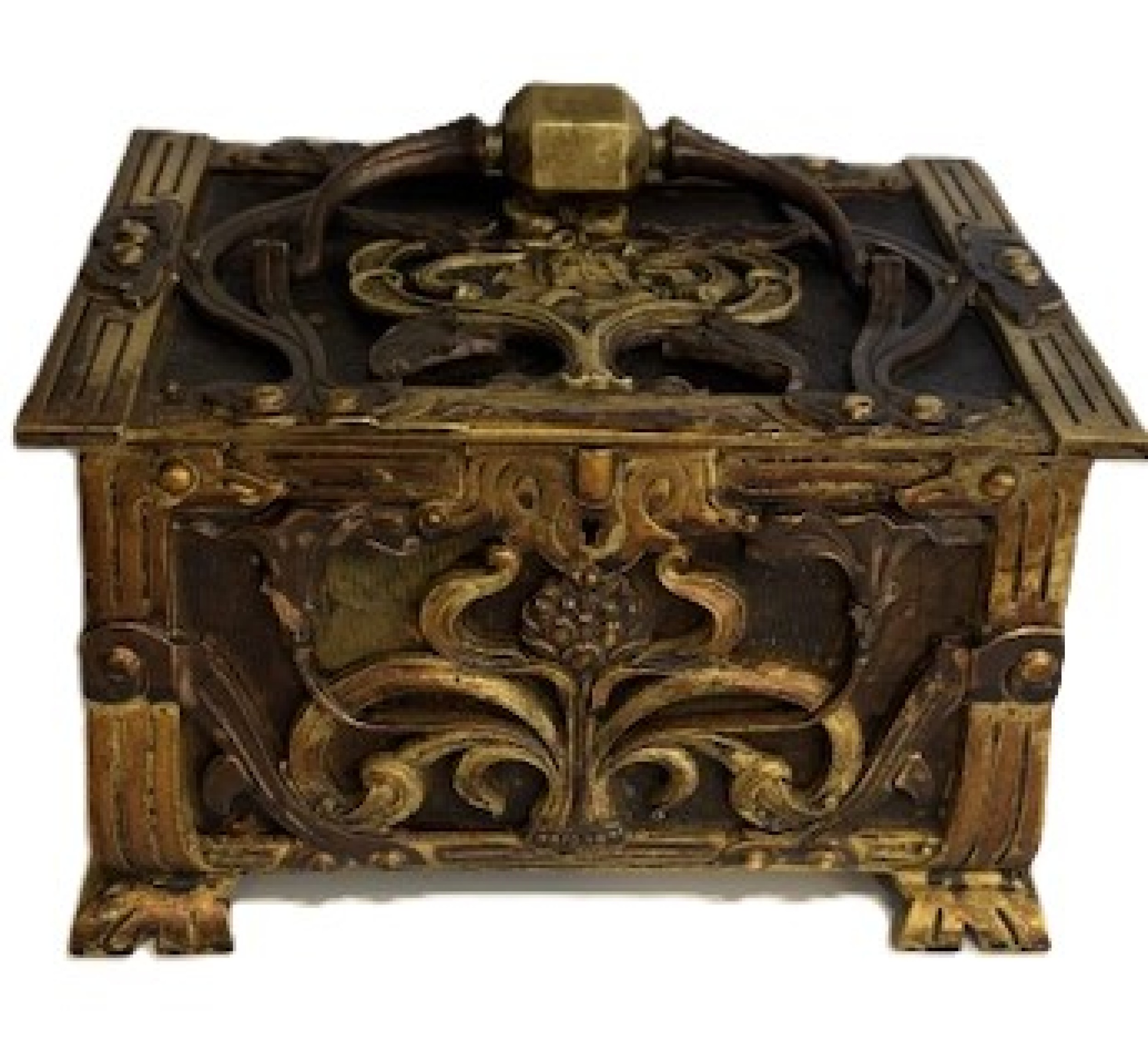 Choose one of the options below.Art Nouveau brass and copper box with head and green velvet interior