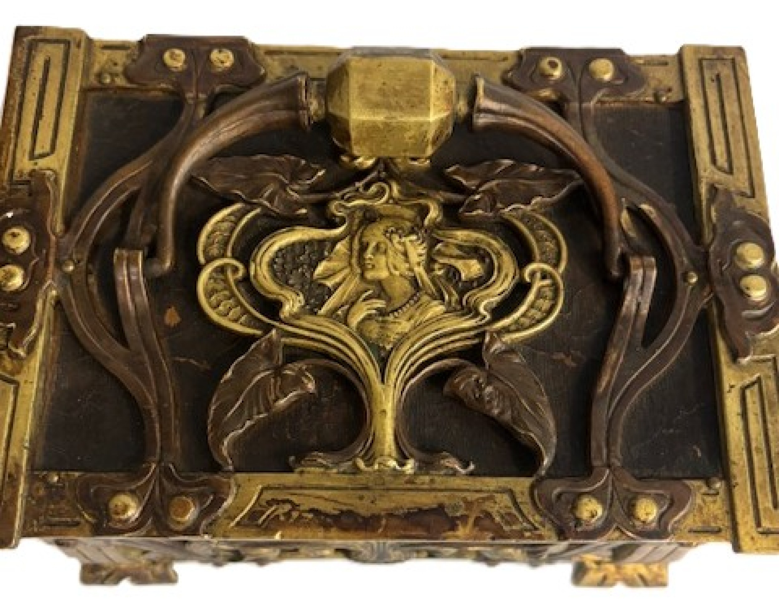 Art Nouveau brass and copper framed box over embossed paper having a floral whiplash design and head of lady with a green velvet interior