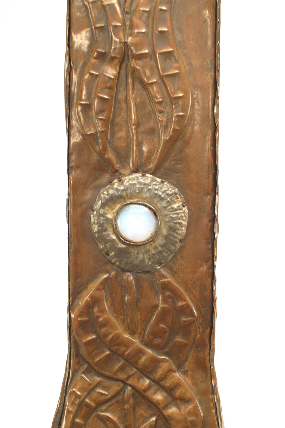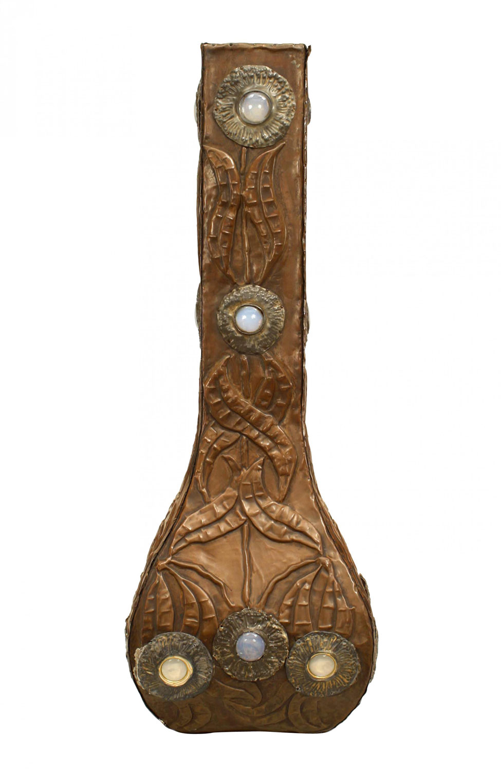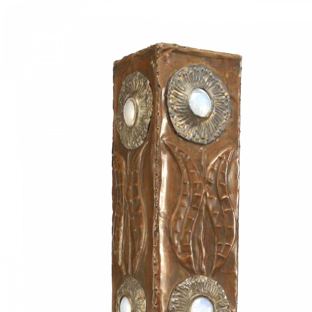 Art Nouveau copper veneered square shaped vase with tapered neck and incised floral design with opaline inserts as flowers.