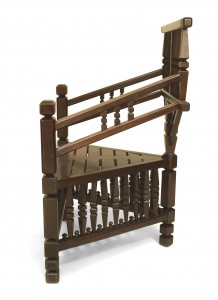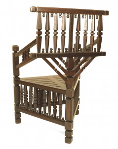 English Aesthetic Movement (Arts & Crafts) large dark oak stained arm chair with a triangular shape and geometric spindle and finial design on back and stretcher.
