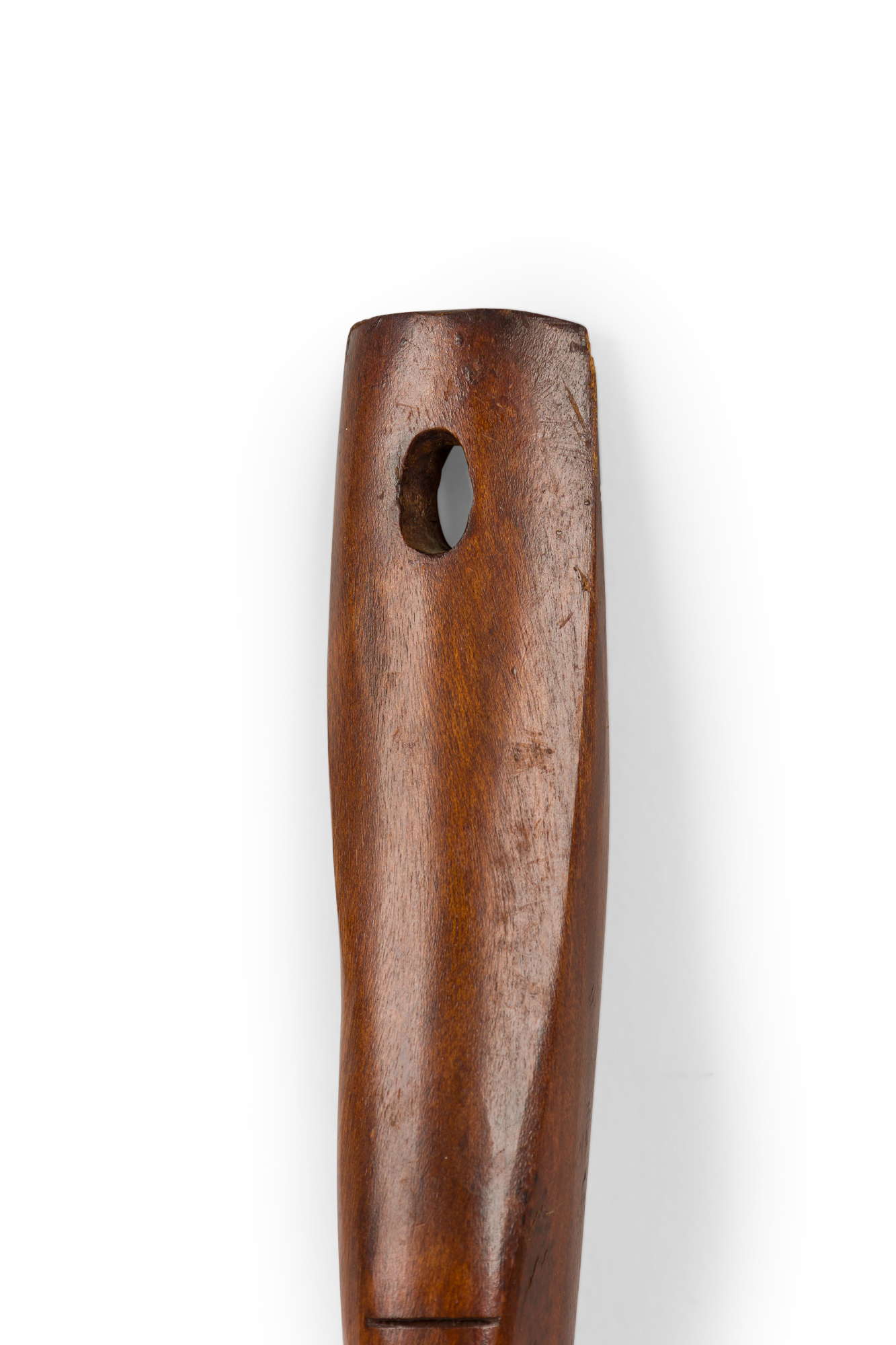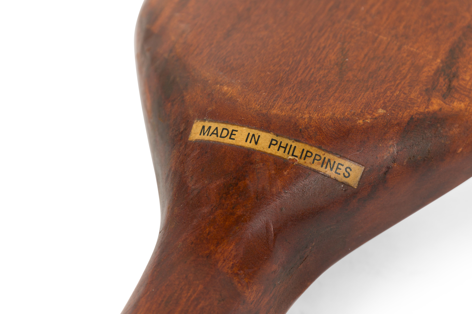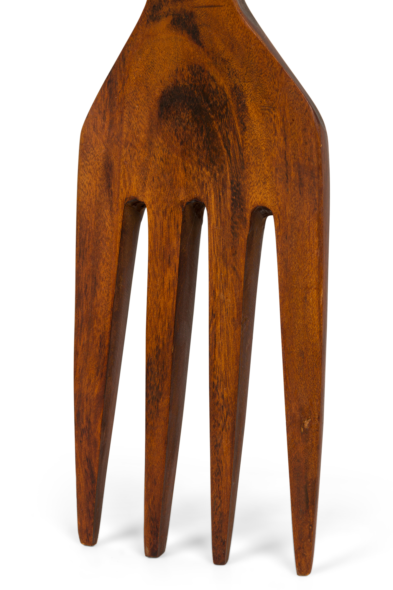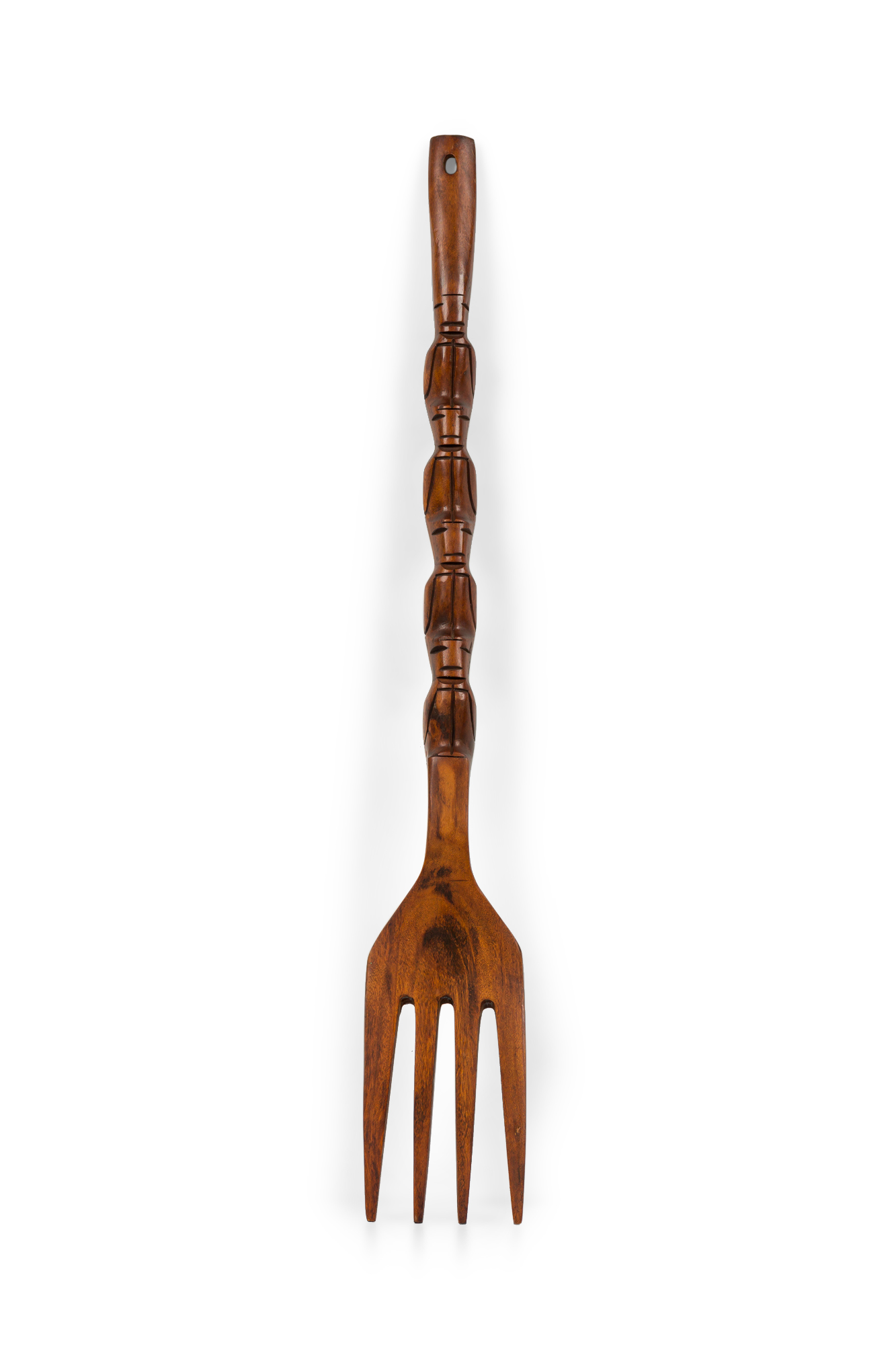 Asian Mid-Century hand carved wooden oversized tiki totem fork wall decor with a repeated etched pattern resembling an animal along the handle and a hole at the end for hanging (MADE IN PHILIPPINES) (matching spoon: NWL7126A)