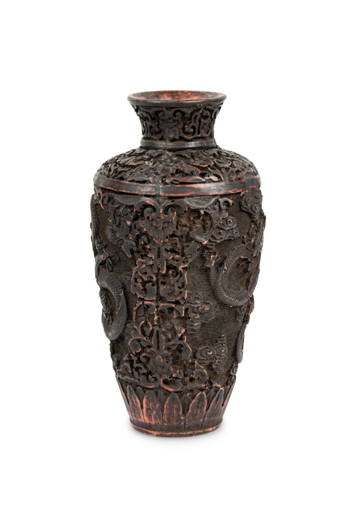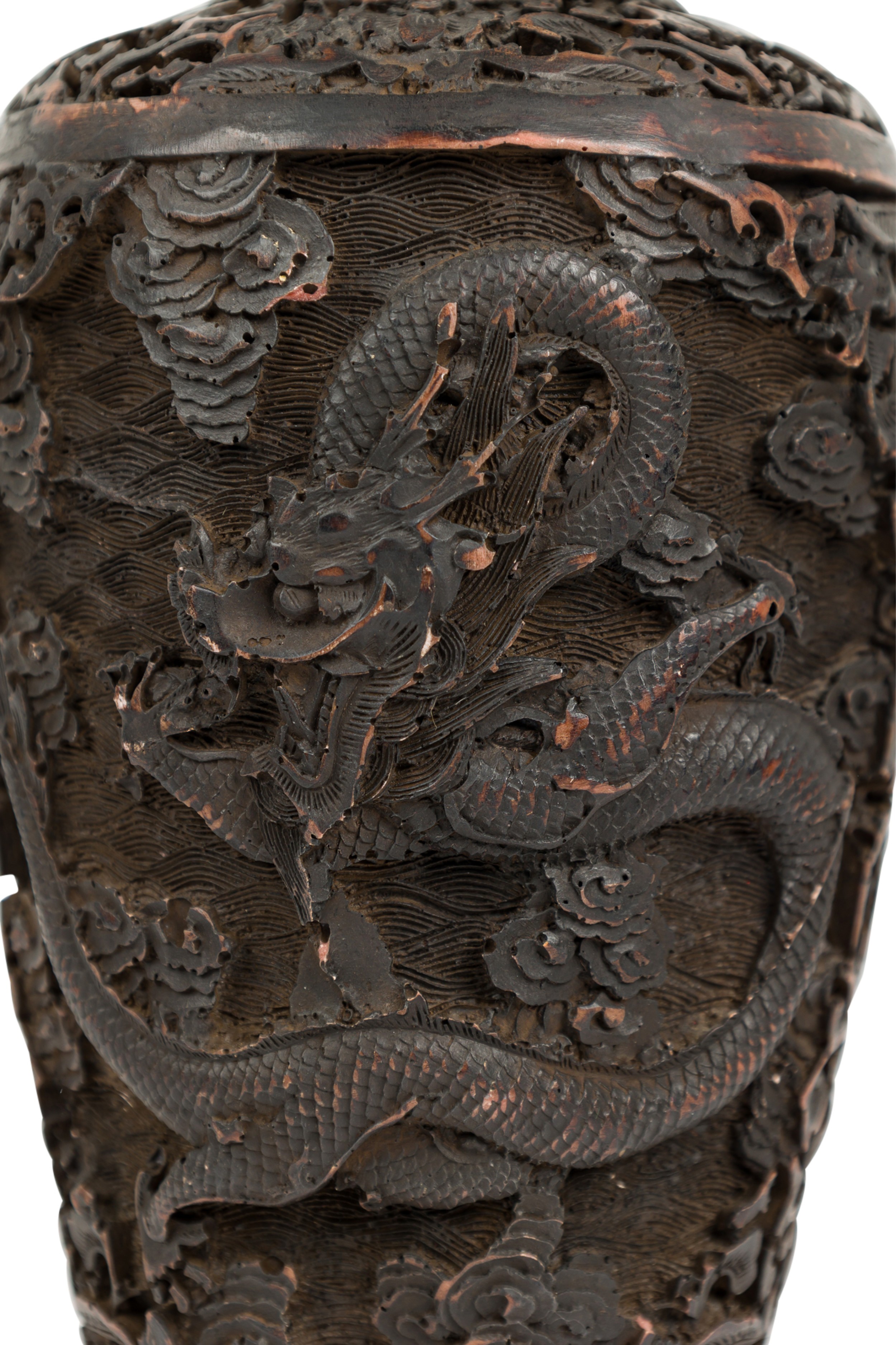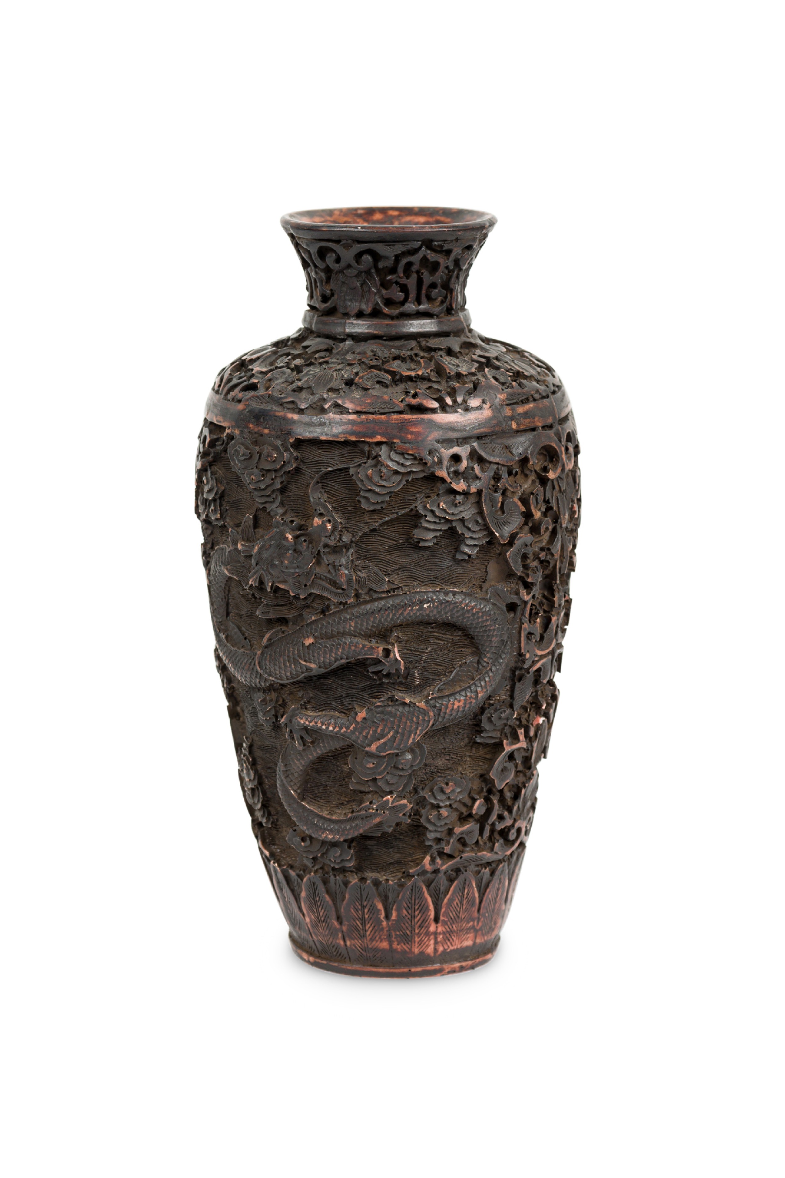 Asian Chinese Mid-Century carved cinnabar style vase with two dragons