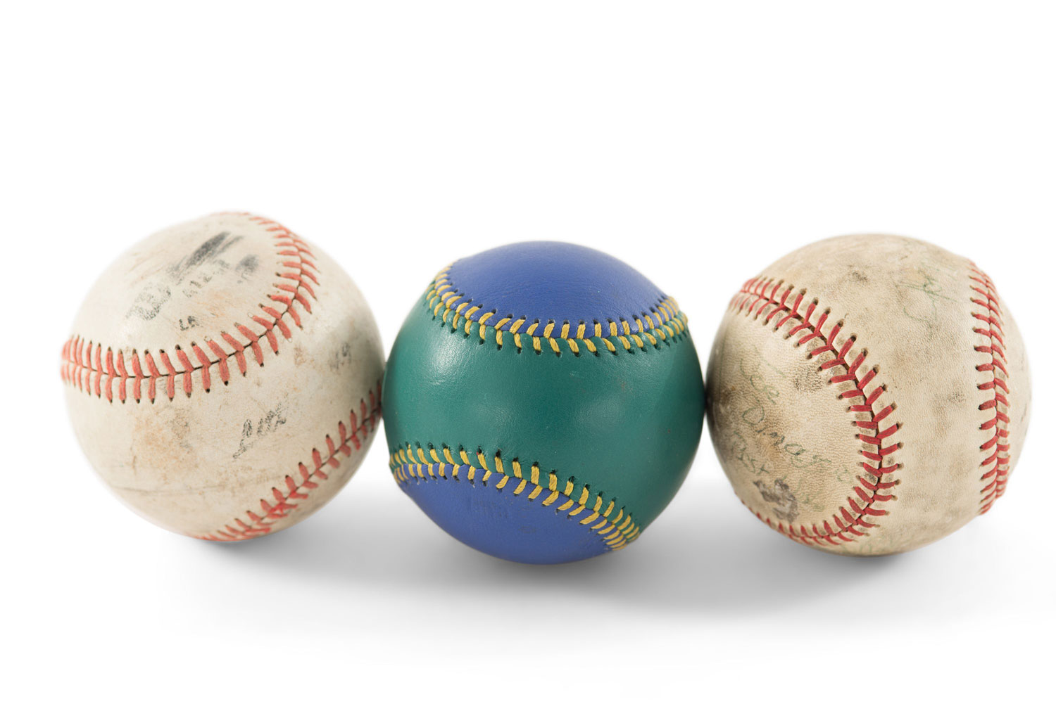 Assorted leather baseballs: 3 white with red lacing, one blue and green with yellow lacing (PRICED EACH)