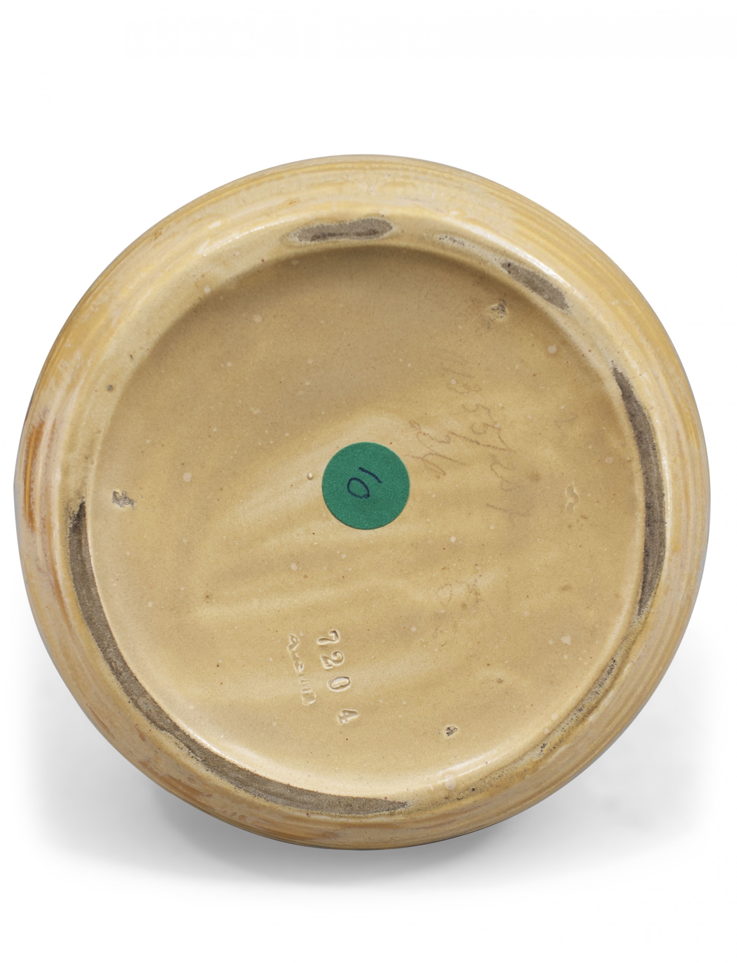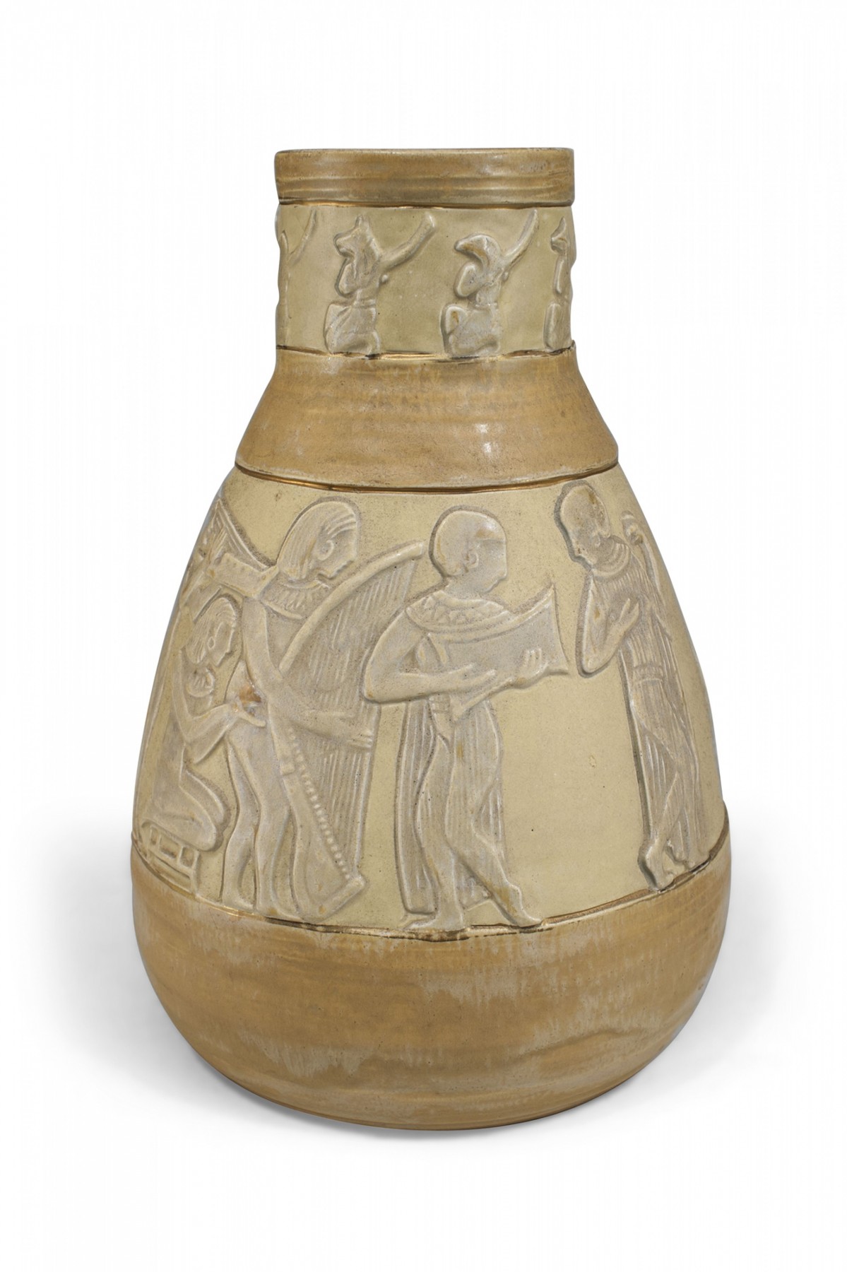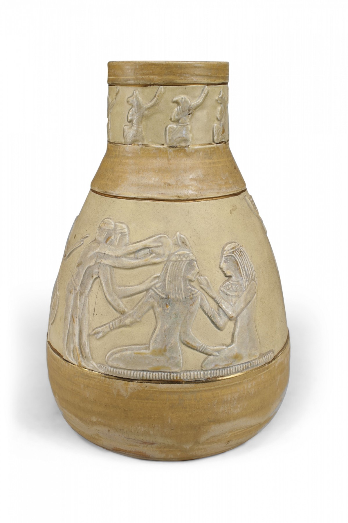 Austrian Art Deco beige and cream colored porcelain vase with glazed classical Egyptian figures around neck and body of vase.