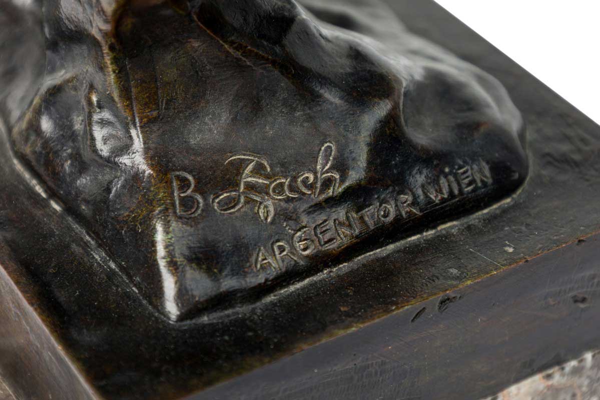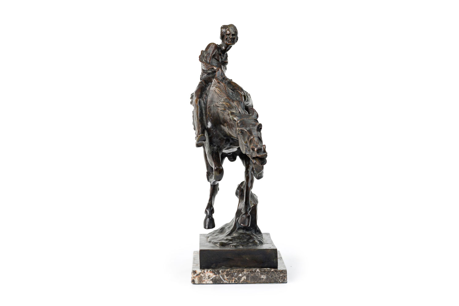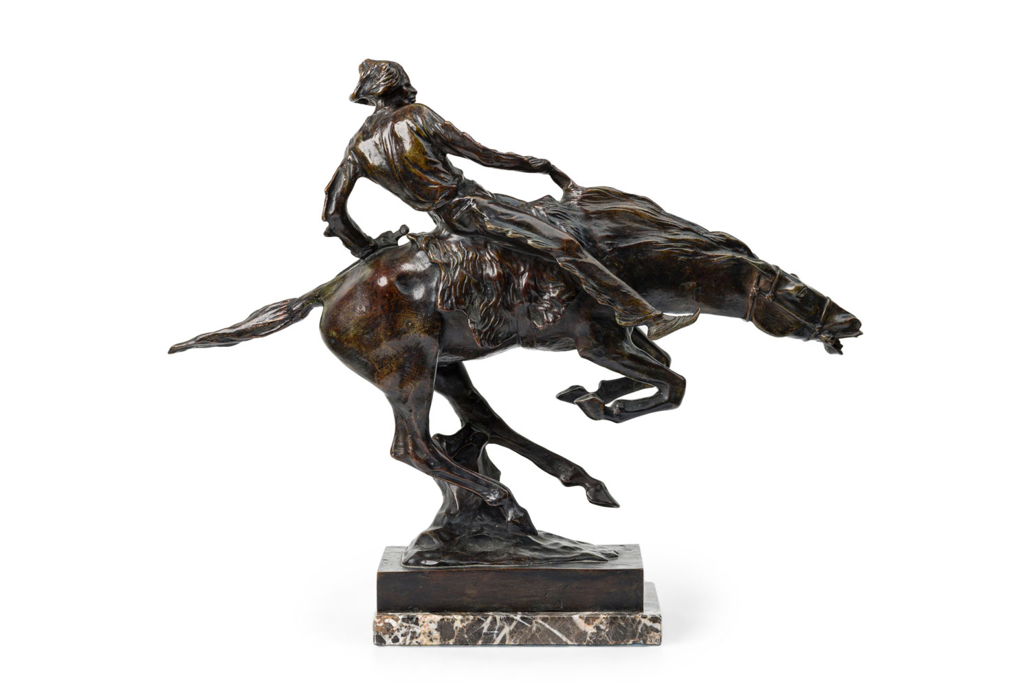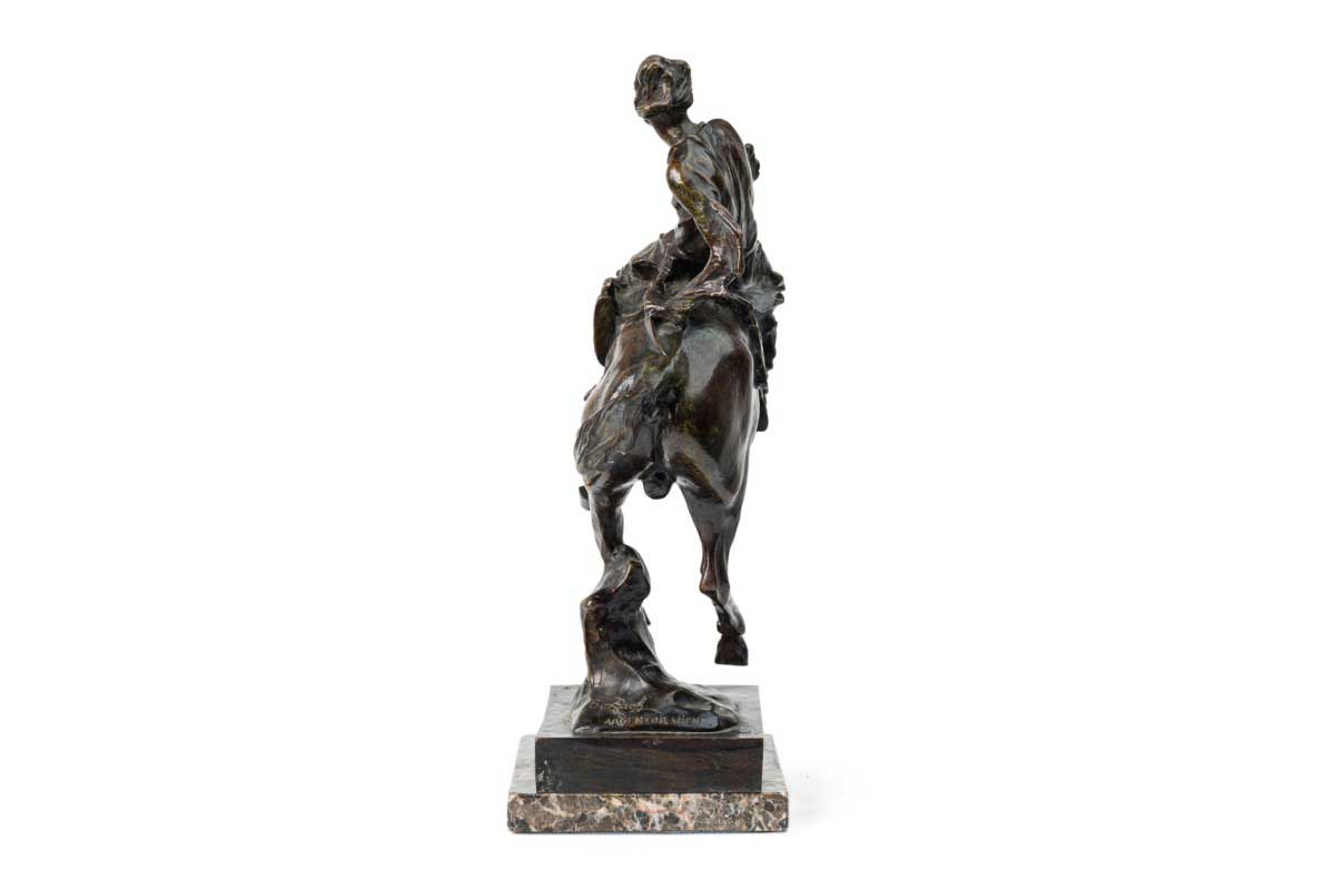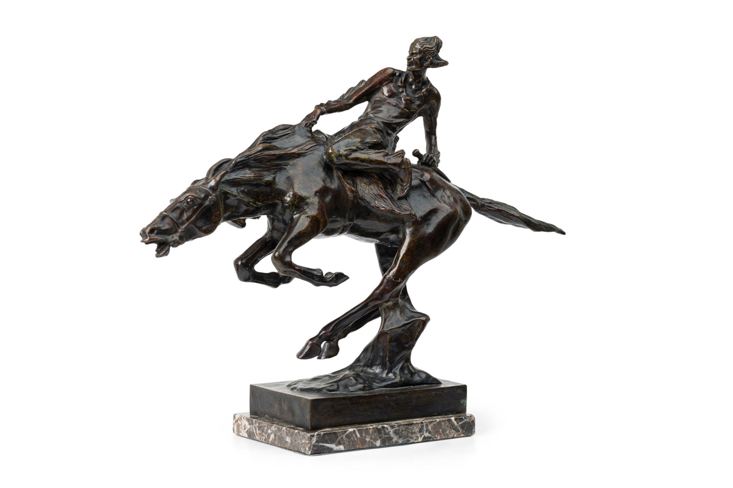 Austrian bronze figure of Native American (Indian) riding bare-back on bucking horse with grey marble base (signed B FACH, Argentor Wien)