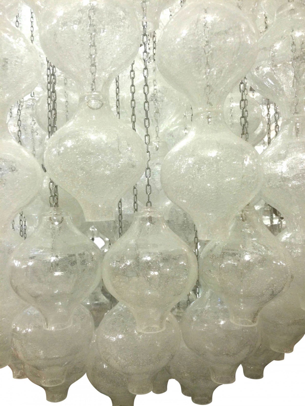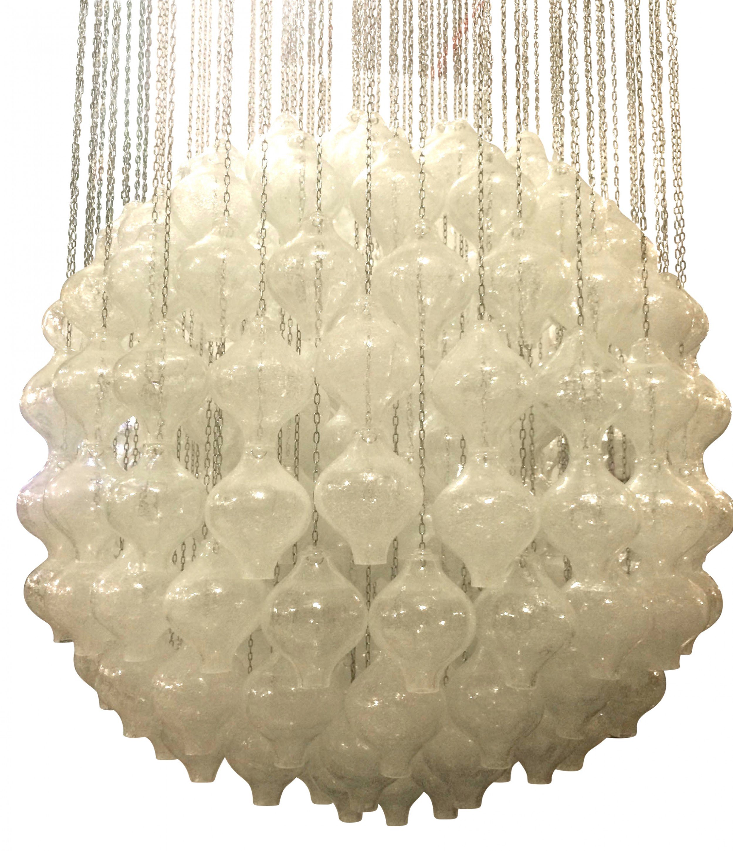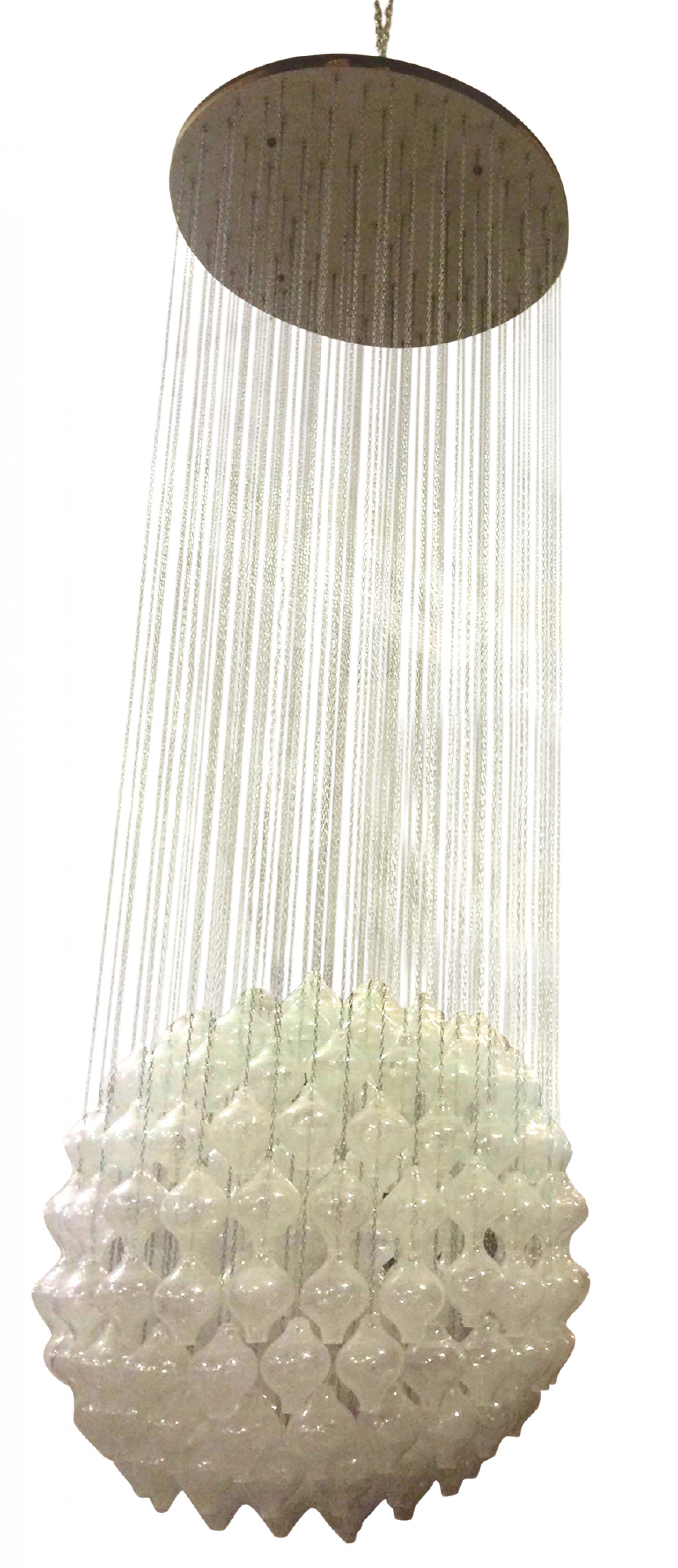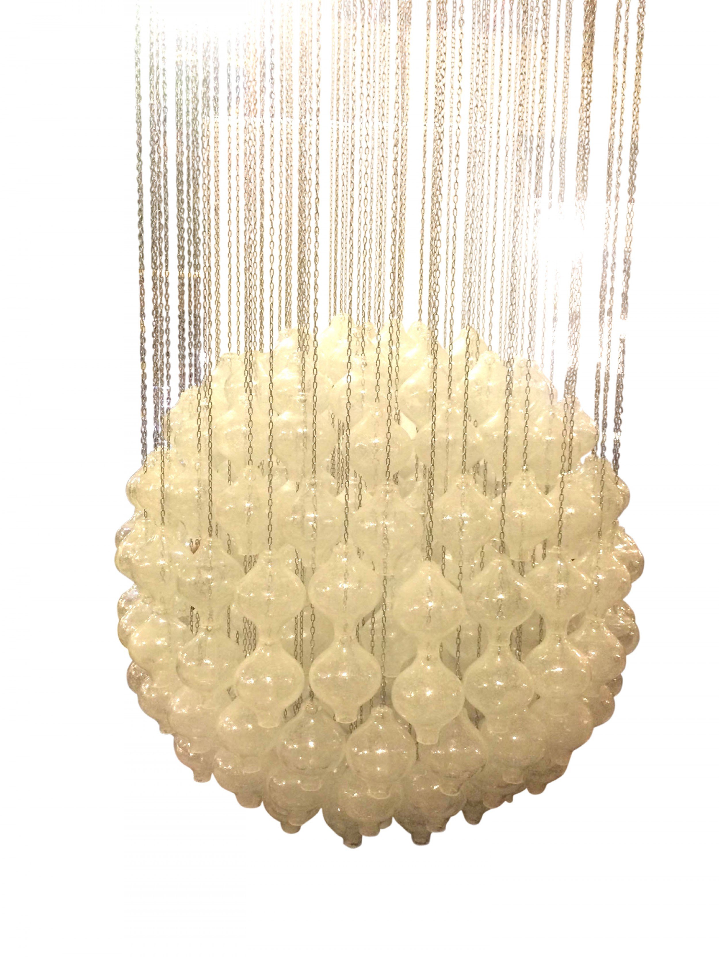 Austrian Post-War Design (1960s) "Pagode" pendant chandelier with textured clear glass balls hanging with metal chains from a round white painted canopy (by J. T. KALMAR)