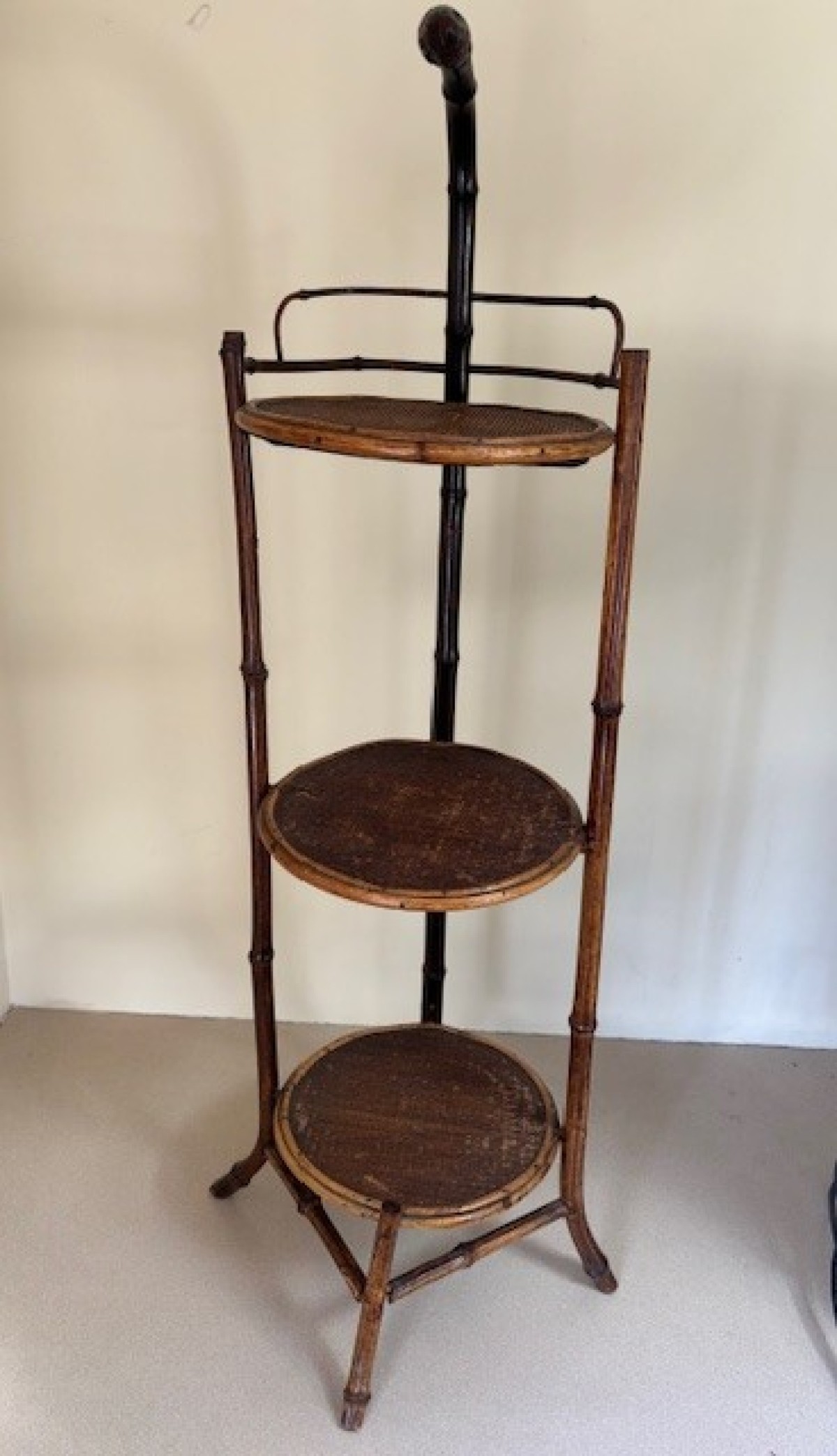 Bamboo English Victorian large 4 legged round dining table with pine top and recessed woven apron.