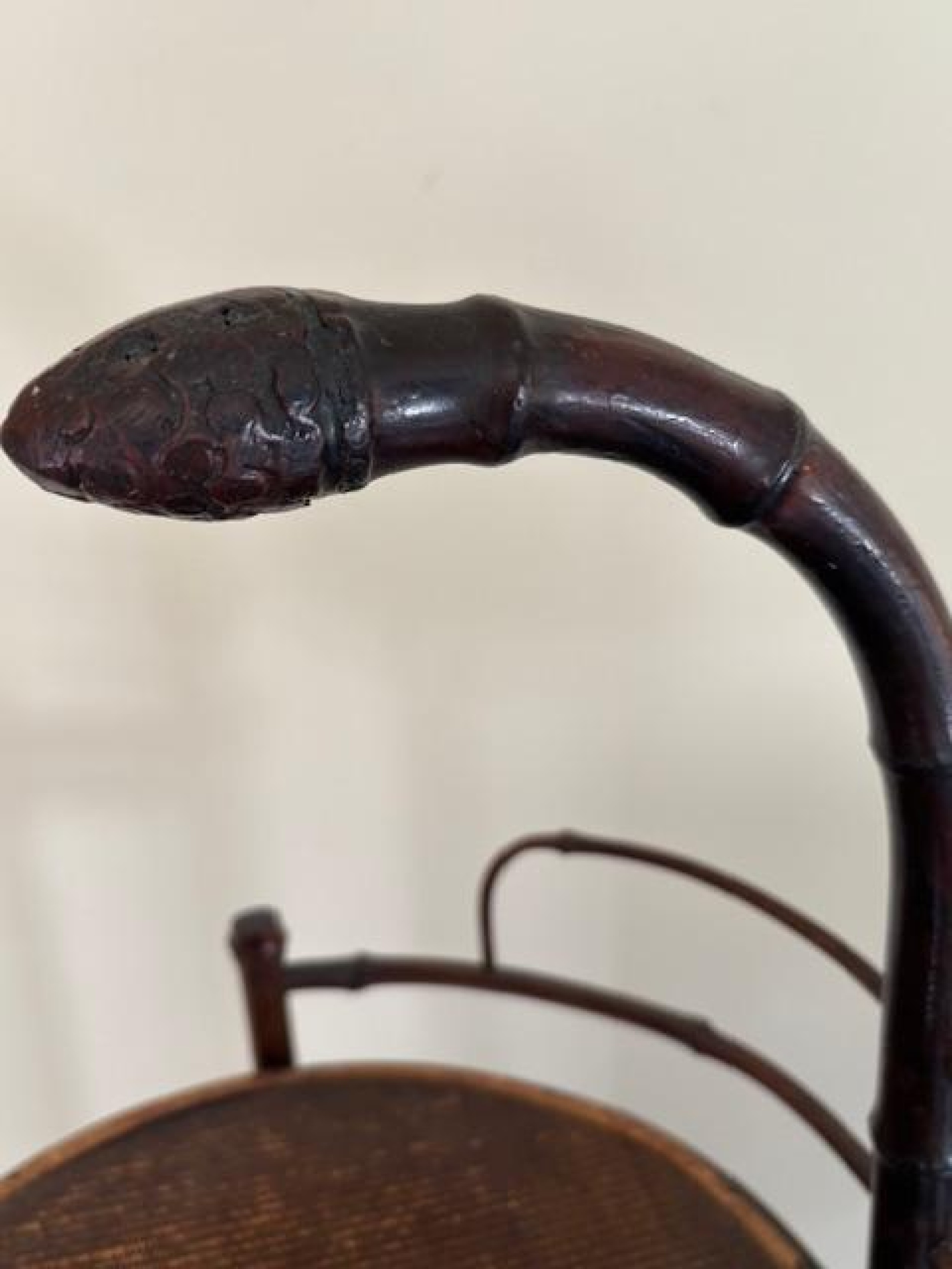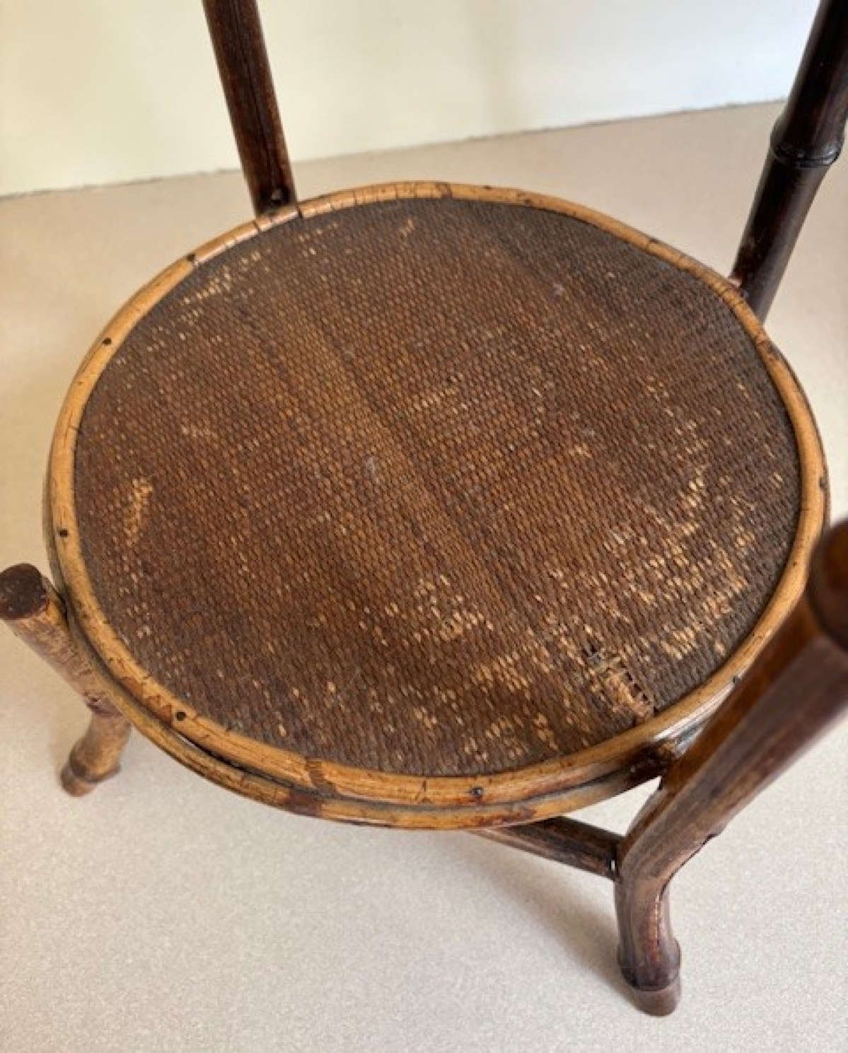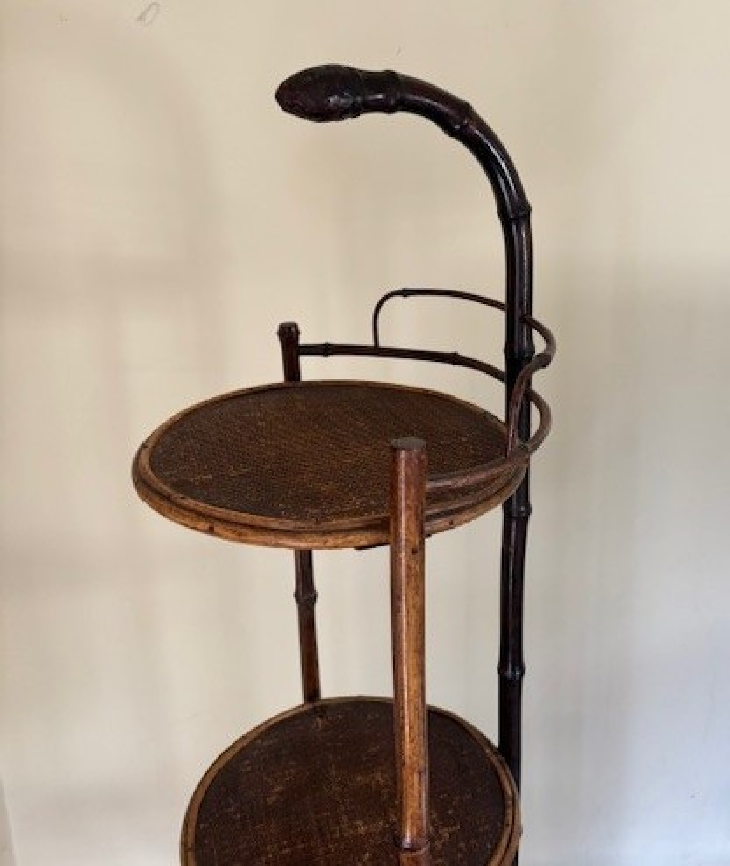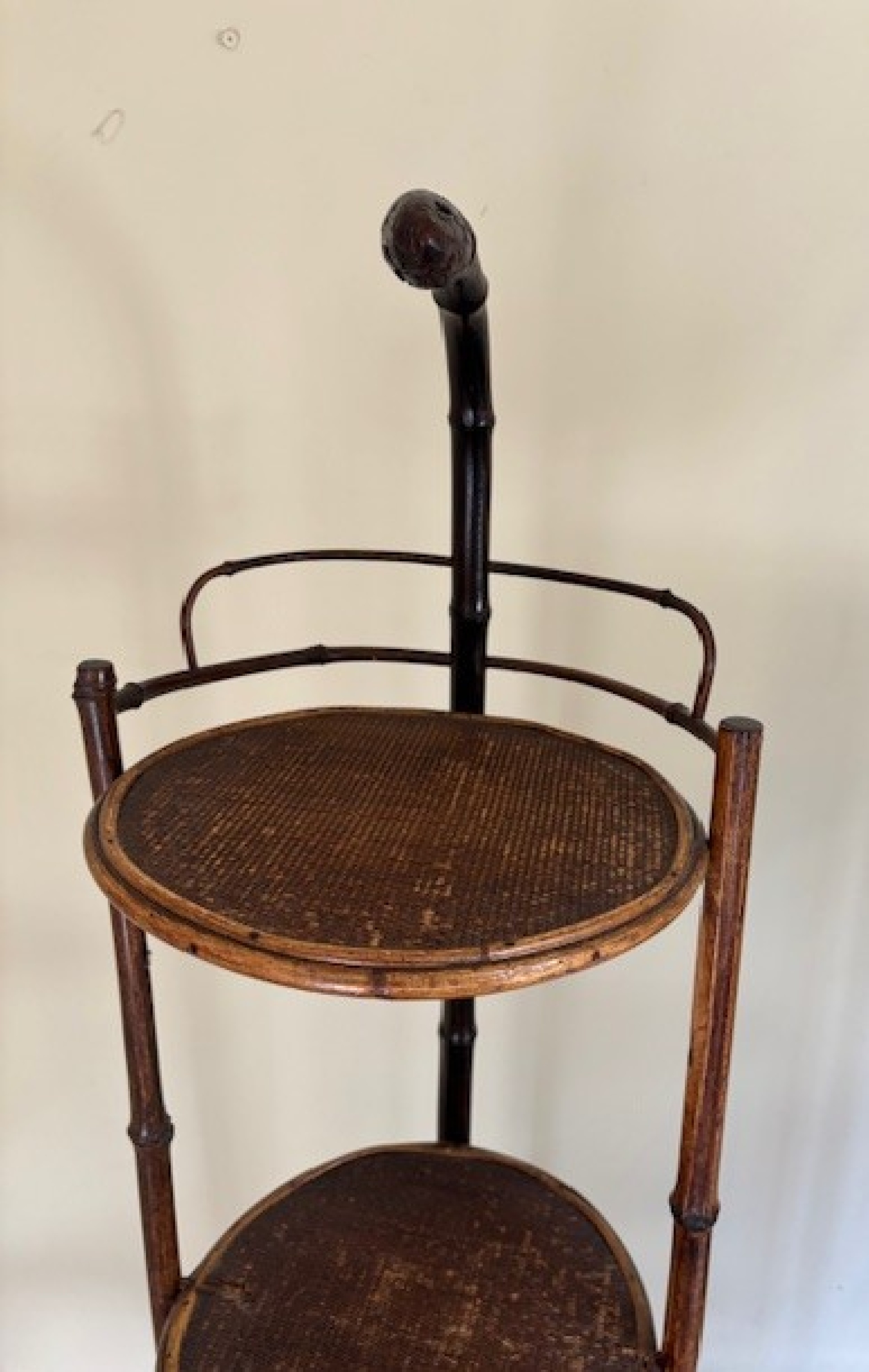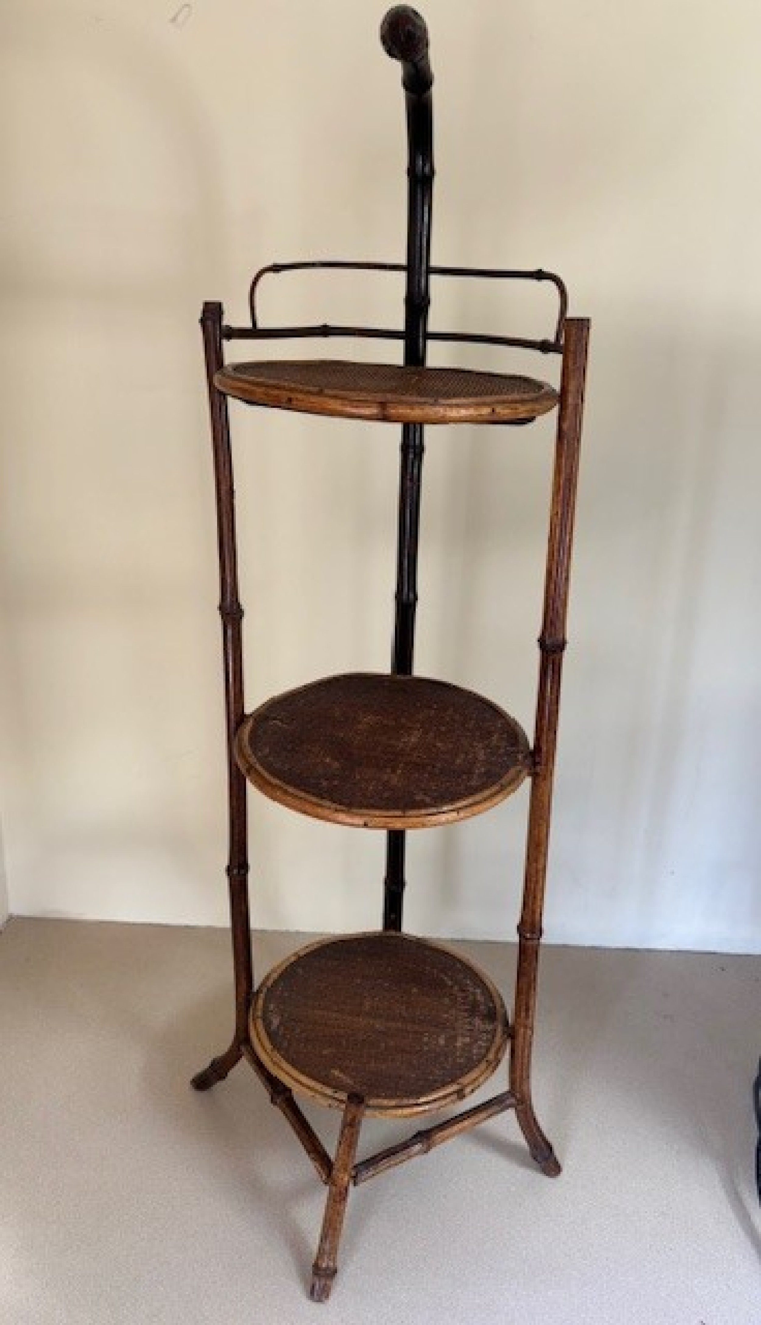 English Bamboo muffin stand with 3 round woven shelves with a half gallery and handle