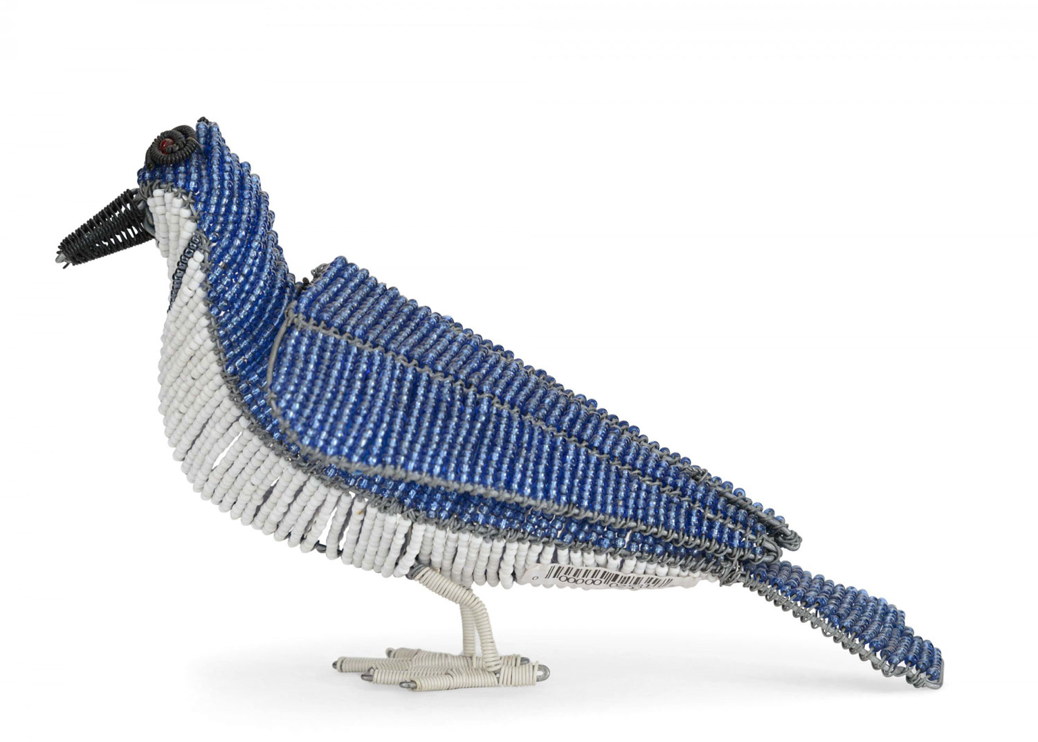 Blue and white beaded wire sculpture of a bird