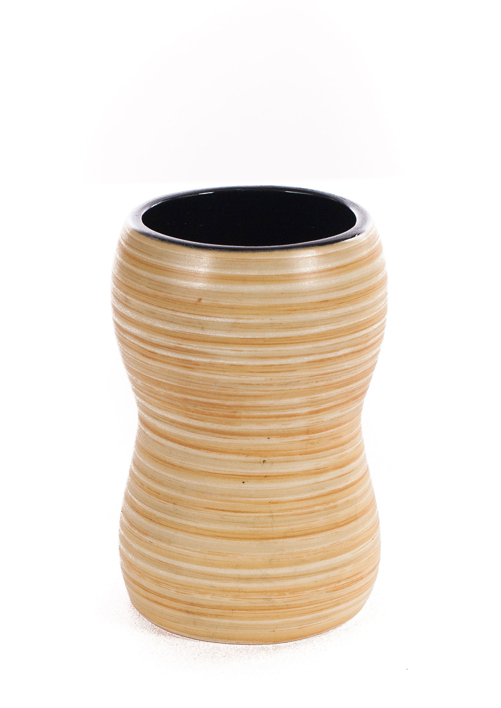 Small waisted ceramic vase with a horizontally striped beige and orange finish and a black glazed interior