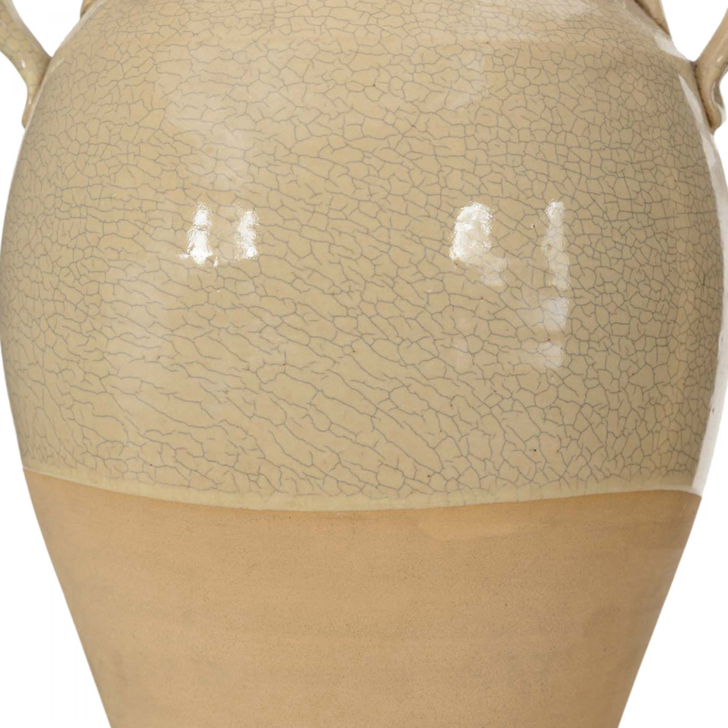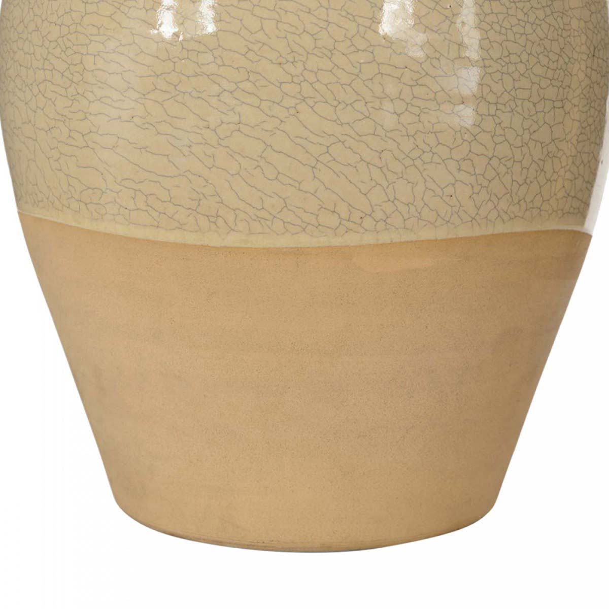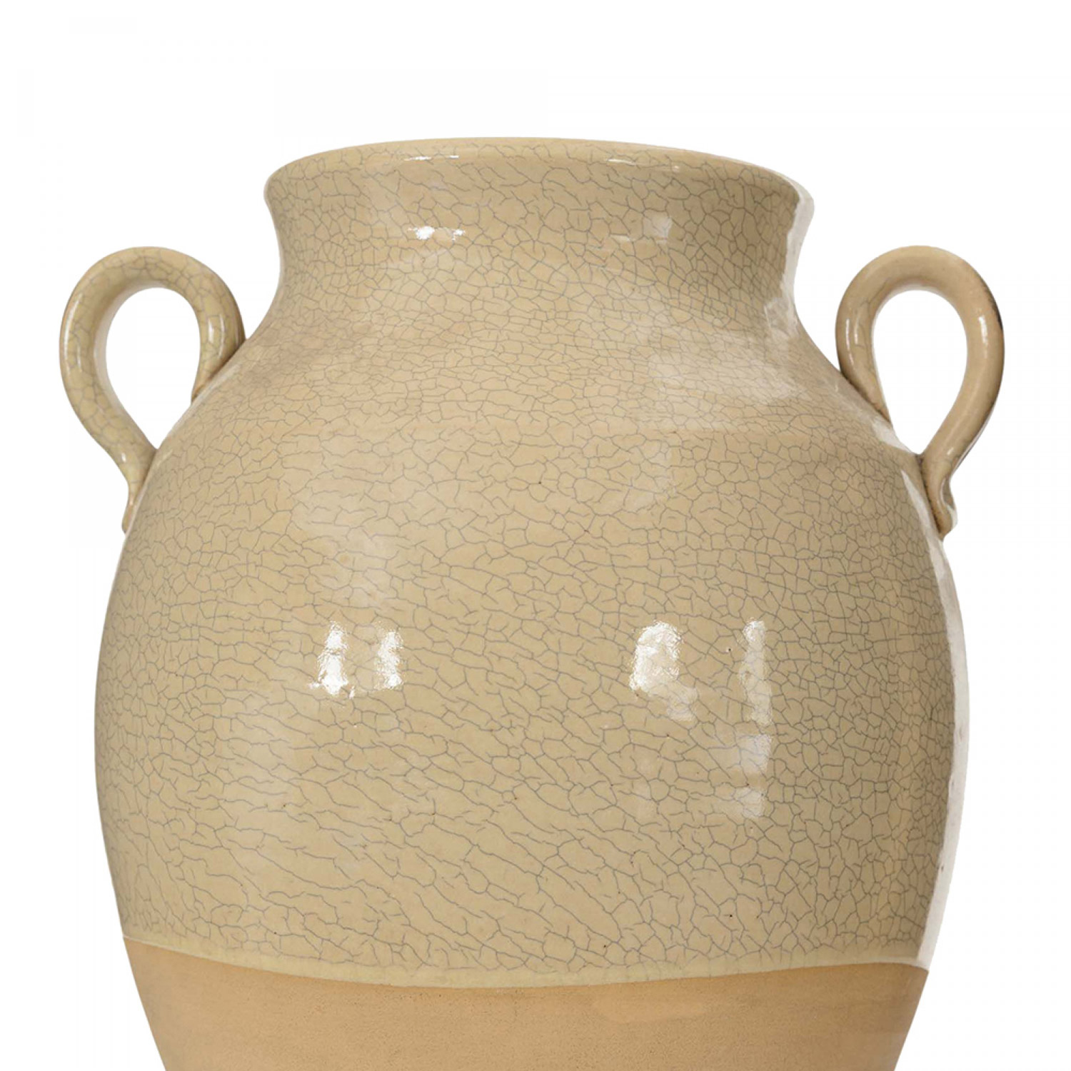 Large ceramic urn with a matte dark beige glaze on the bottom half, a light beige crackle glaze on the upper half, and two small looped handles