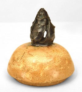 Belgian Arts & Crafts glazed beige porcelain vase with cover having an open black finial and trimmed with black decoration and various heads (signed: S HUBLET, marked 213D)