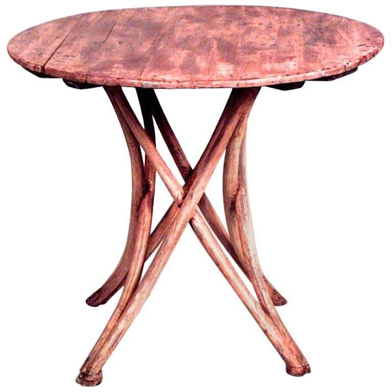 Bentwood (19/20th Century) stripped end table with cross leg design base and round wood top