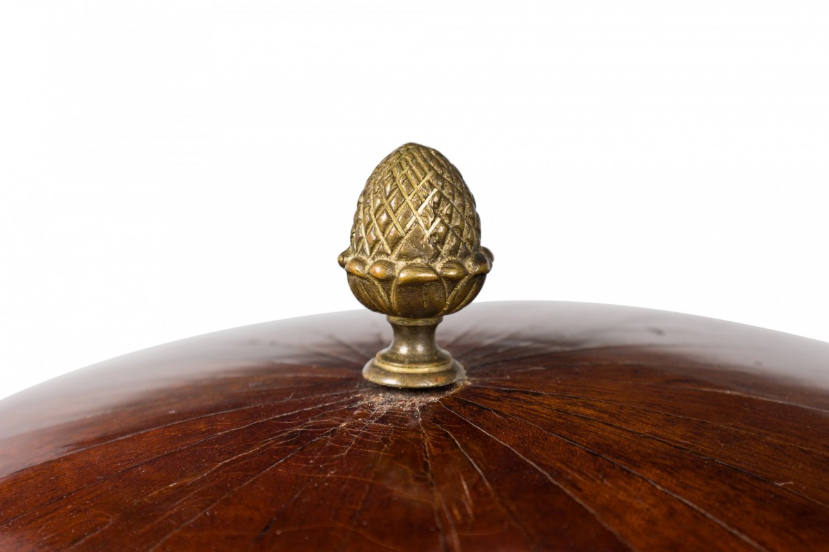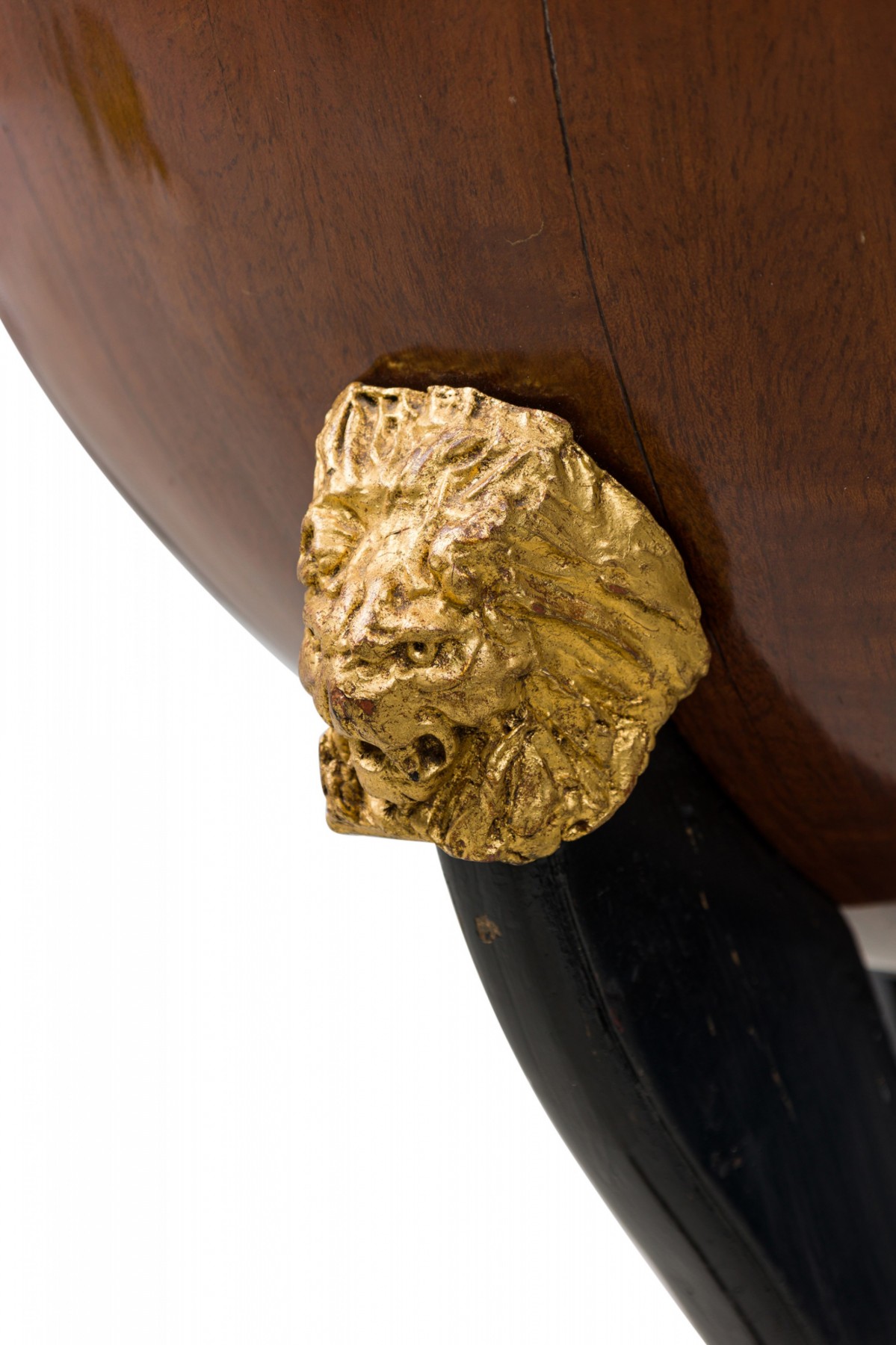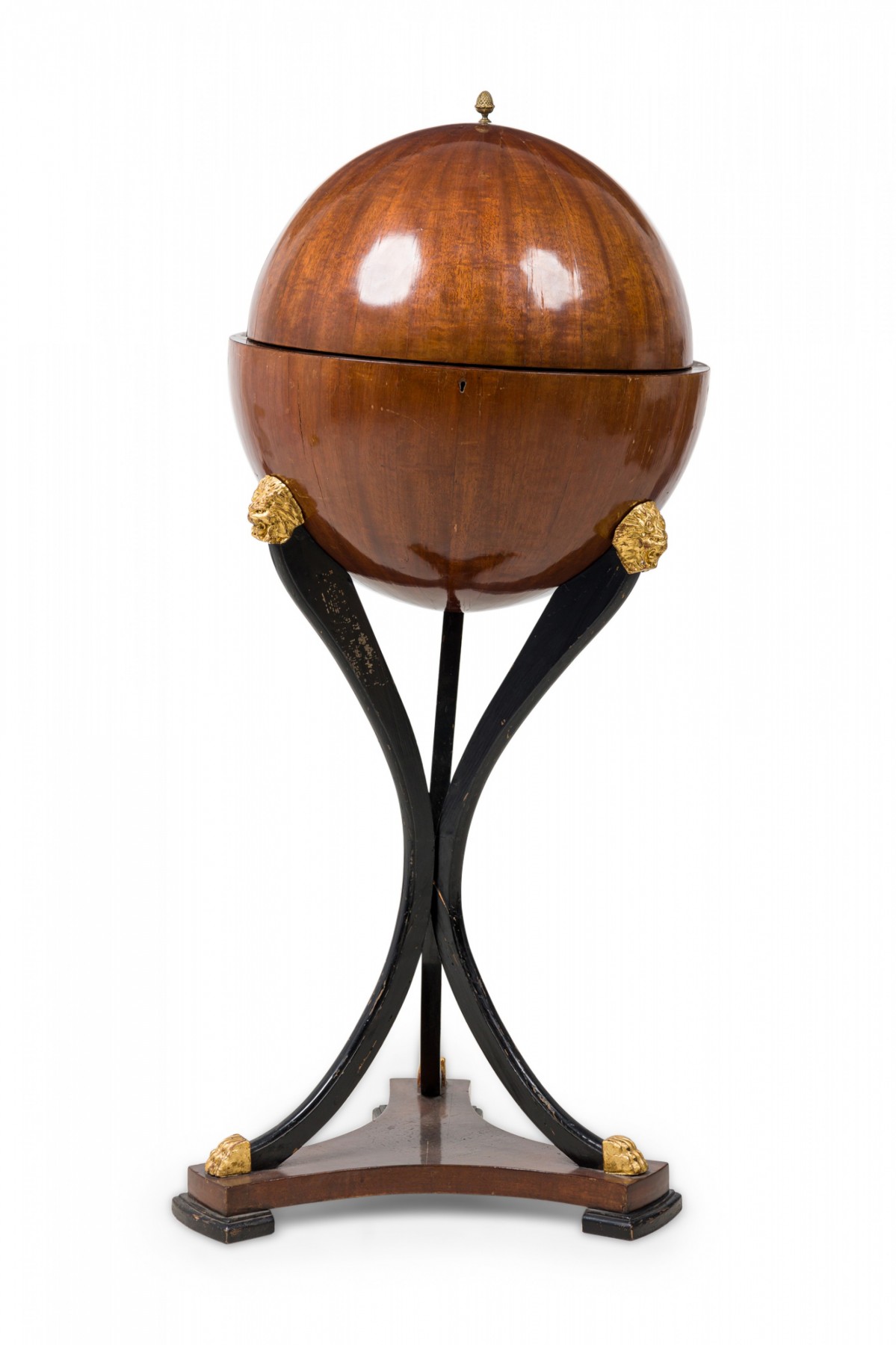 Biedermeier globe-form work desk with a mahogany structure that opens to reveal a several small compartments, with parcel gilt and ebonized detail, with applied lions' head decorations at the top of each leg and a brass artichoke finial, resting on three ebonized incurved legs attached to a triangular base with gilt paw feet.