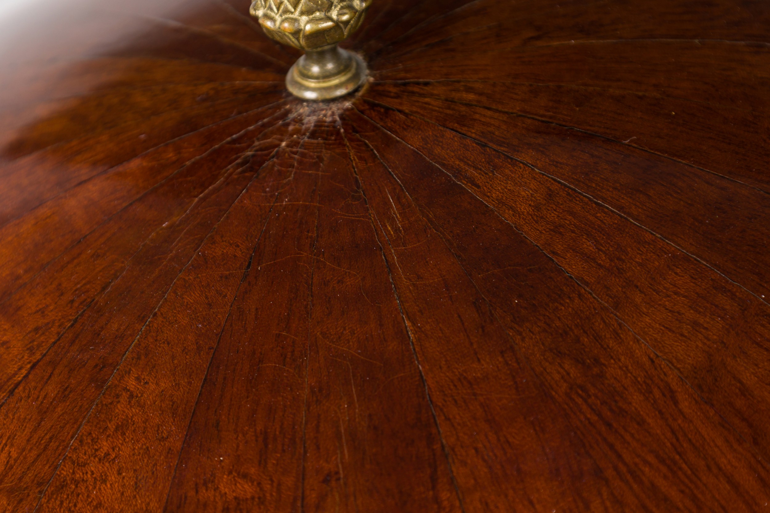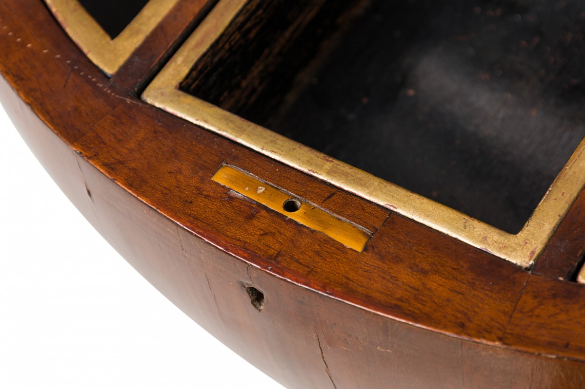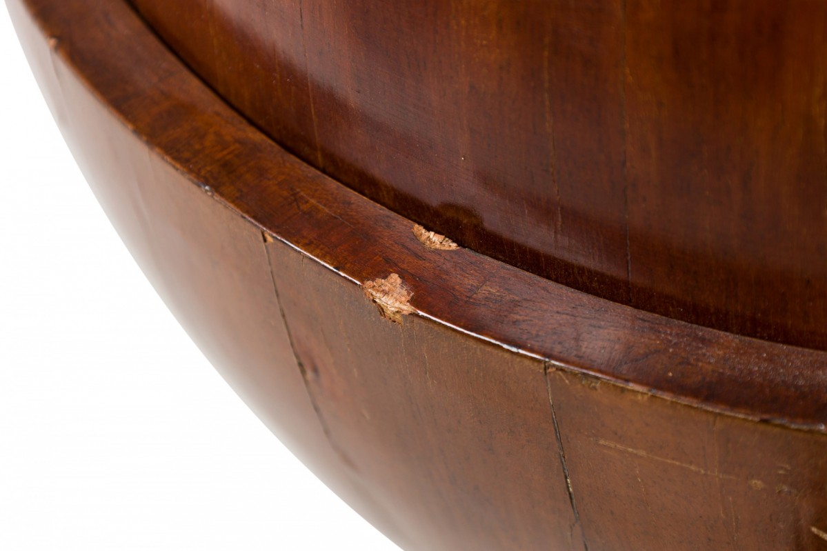 Biedermeier globe-form work desk with a mahogany structure that opens to reveal a several small compartments, with parcel gilt and ebonized detail, with applied lions' head decorations at the top of each leg and a brass artichoke finial, resting on three ebonized incurved legs attached to a triangular base with gilt paw feet.