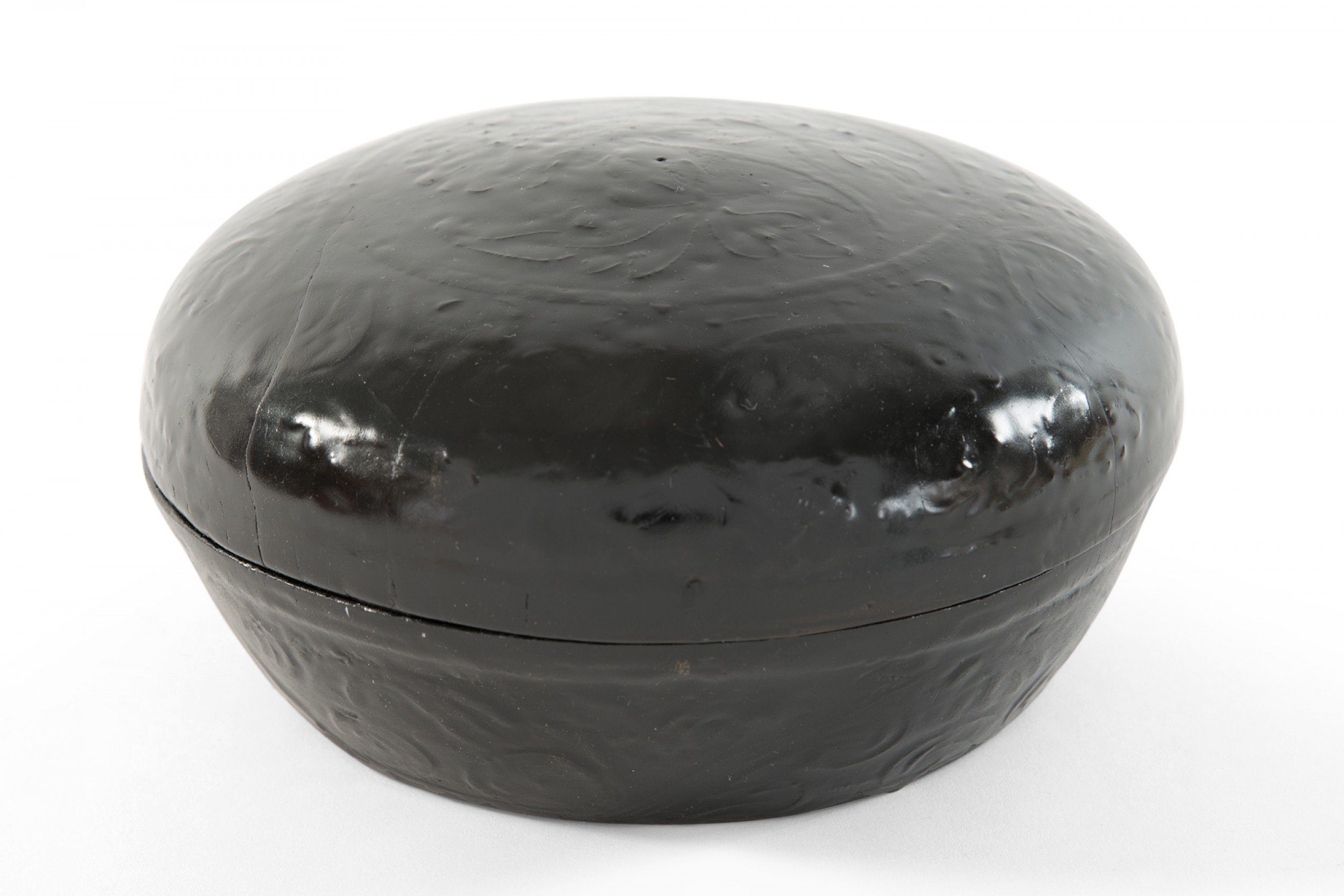 Vintage painted black ceramic dish and domed matching lid with faint raised floral design