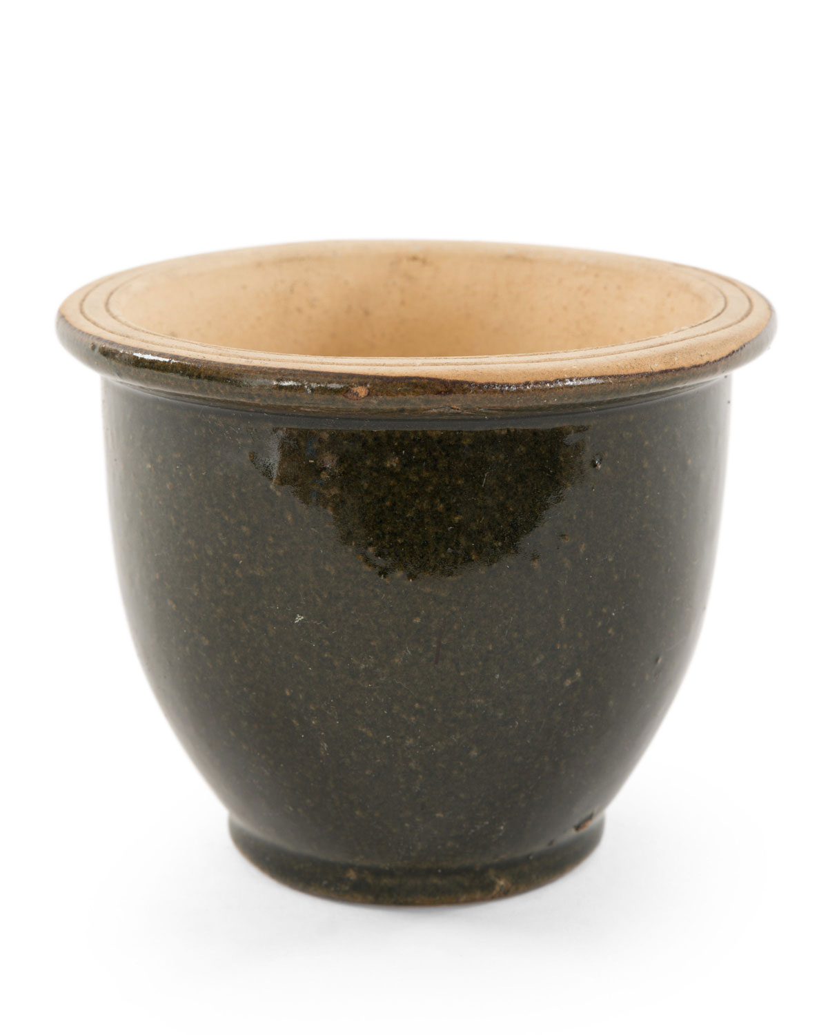 Tapered black glazed cachepot with unfinished beige interior, rounded lip, and a drainage hole in the bottom