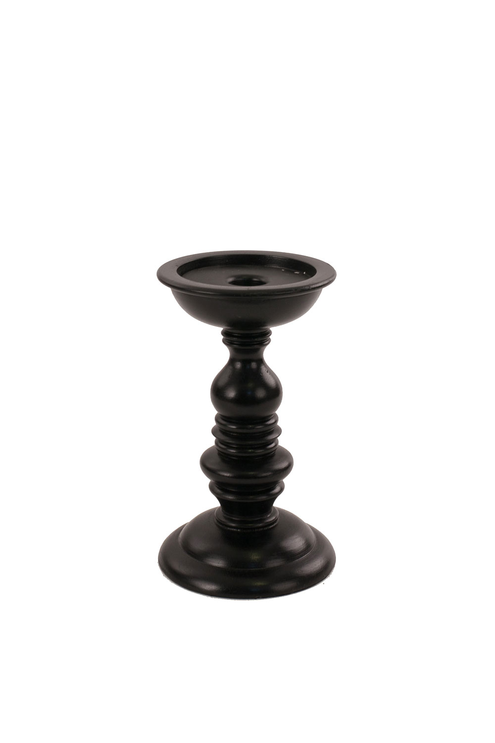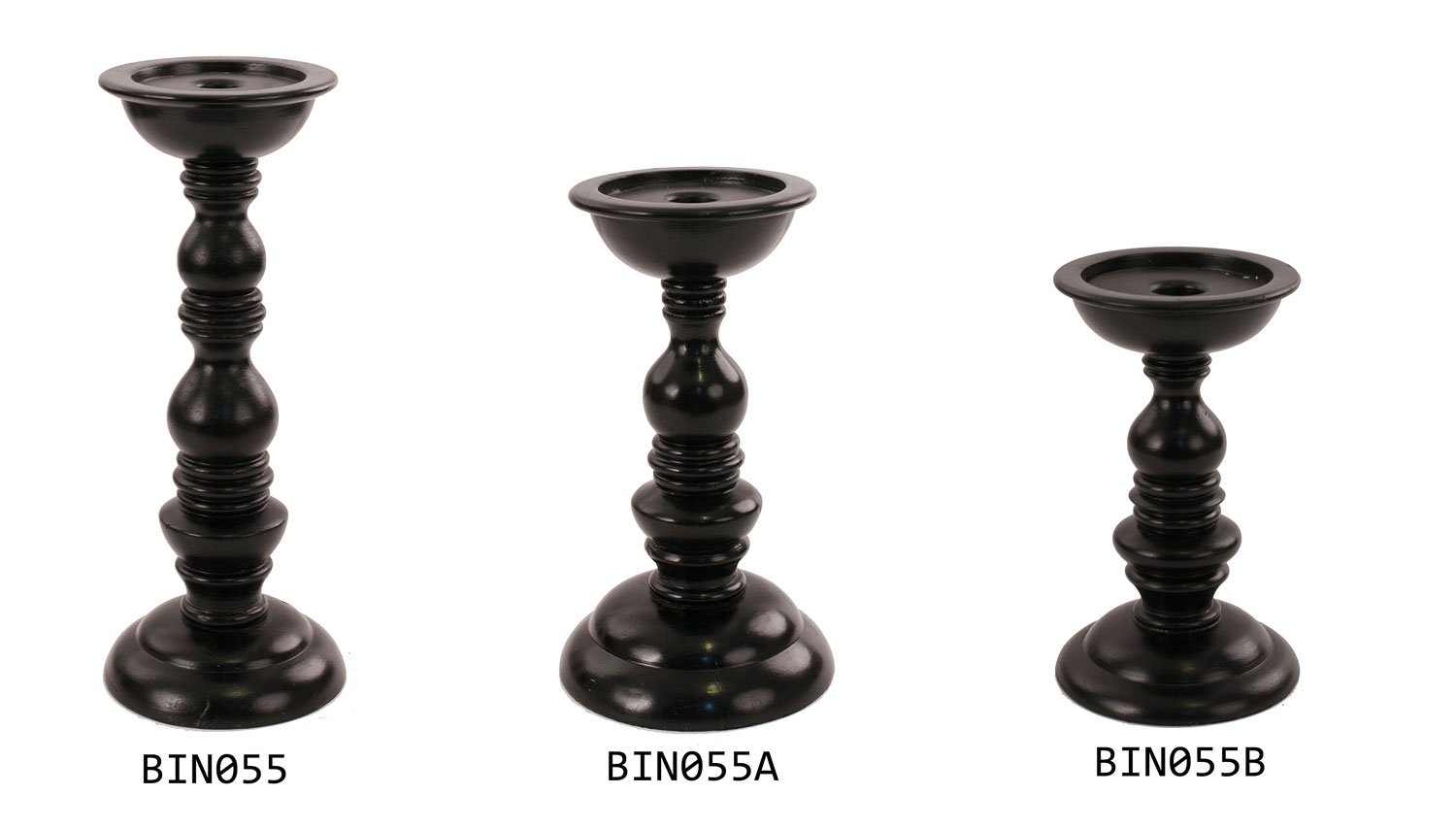 Black painted resin candlestick with a turned shape and a circular base (Related items: BIN055, BIN055A)