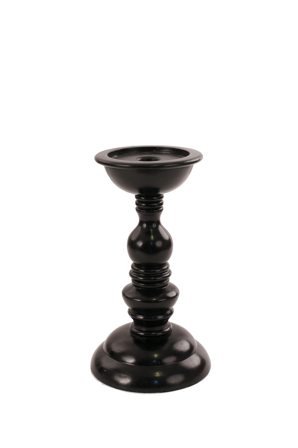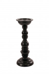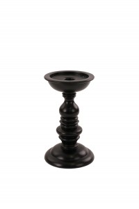 Black painted resin candlestick with a turned shape and a circular base (Related items: BIN055, BIN055B)