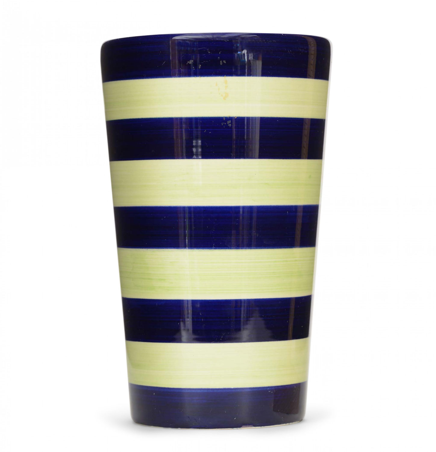 Tall-bodied, tapered glazed ceramic vase with horizontal stripes in dark blue and light green