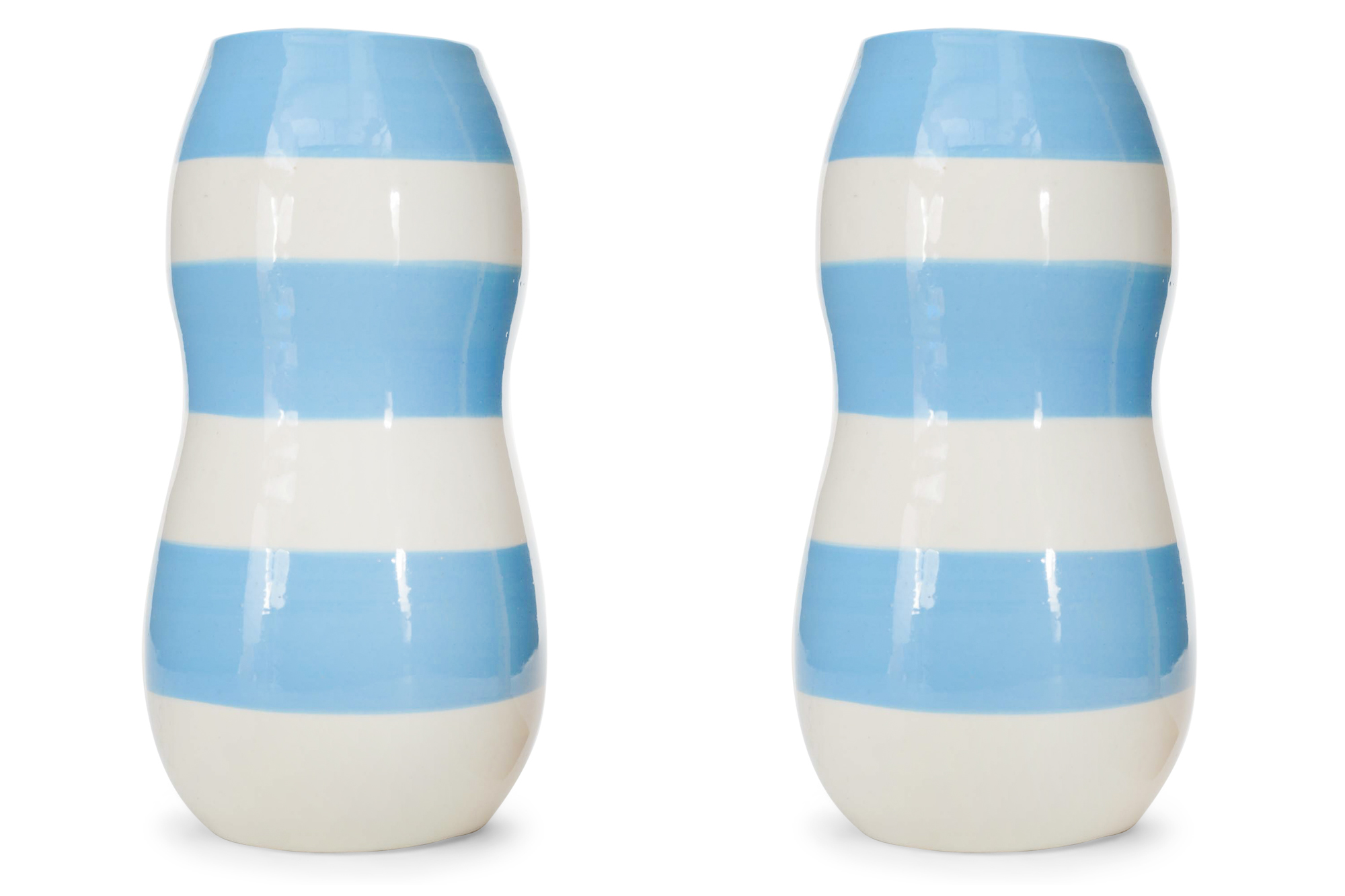 2 Double gourd shaped glazed ceramic vase with horizontal blue and white stripes (PRICED EACH)