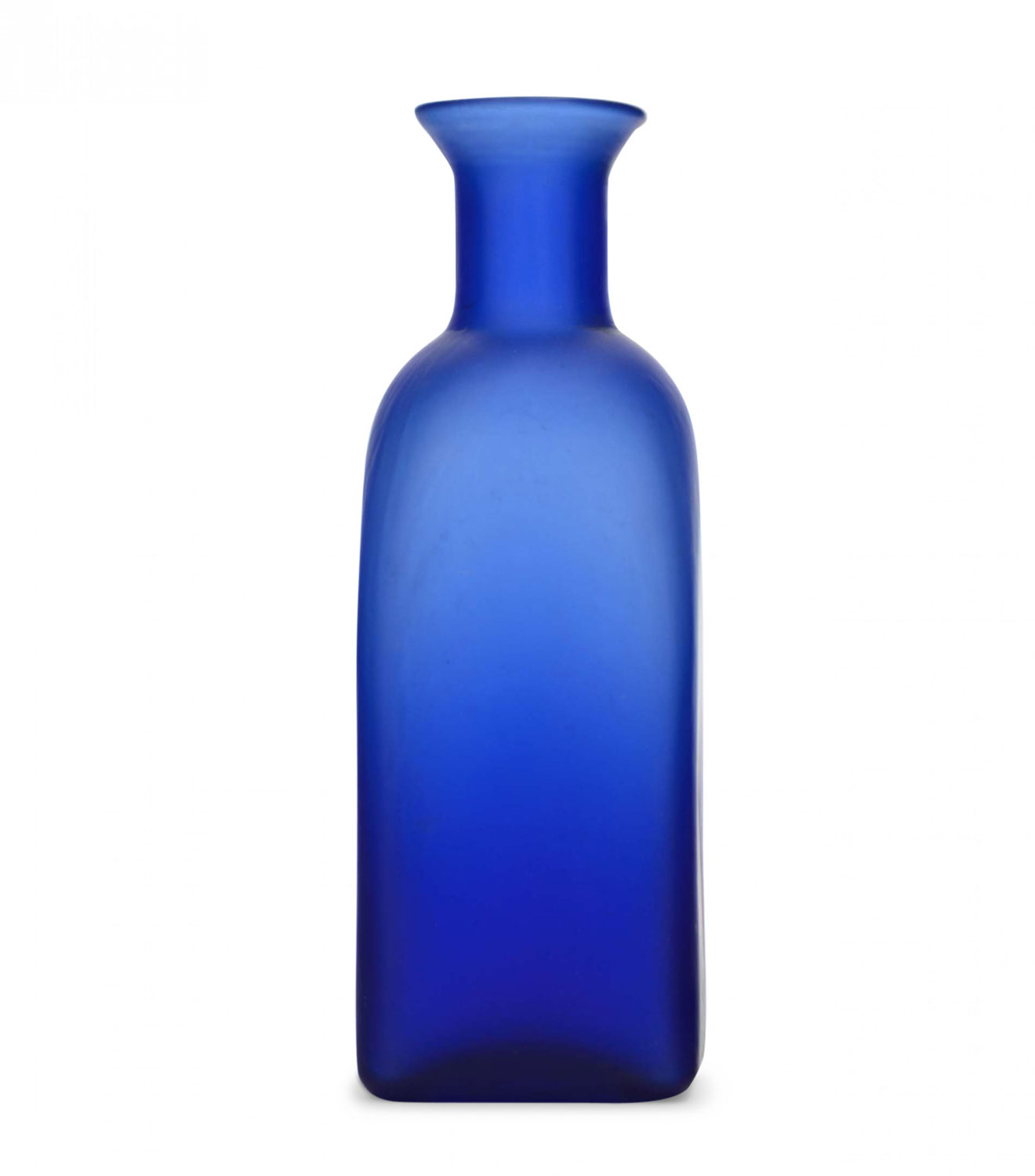 Square-based bottle-shaped blue-tinted frosted glass bud vase with a cylindrical neck and a flared rim