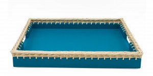 Contemporary rectangular blue leather tray with a woven wicker willow wood edge (Made in Italy) (Related item: MOD021)