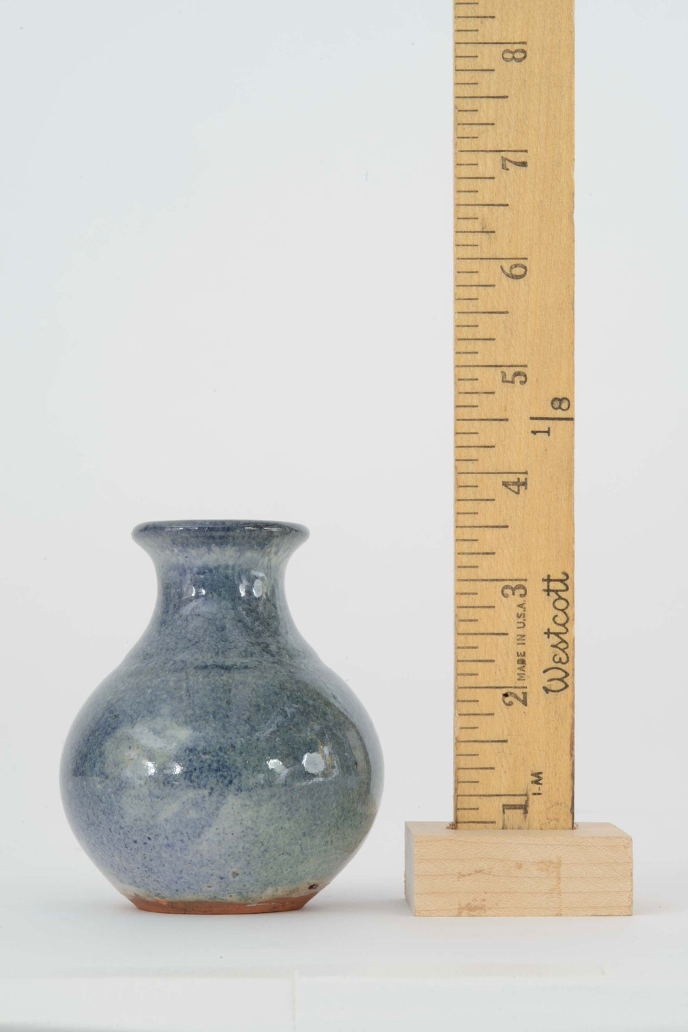 Bulbous-shaped ceramic bud vase with uneven glaze in cream, blue, teal and green