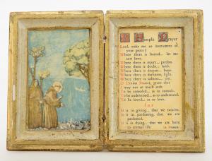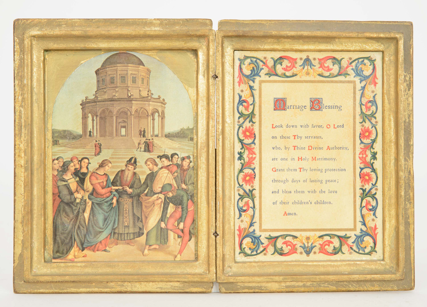 Vintage gilt wood book-style box containing a portrait of a wedding and a marriage blessing with a Florentine border (See also: MP0993L)