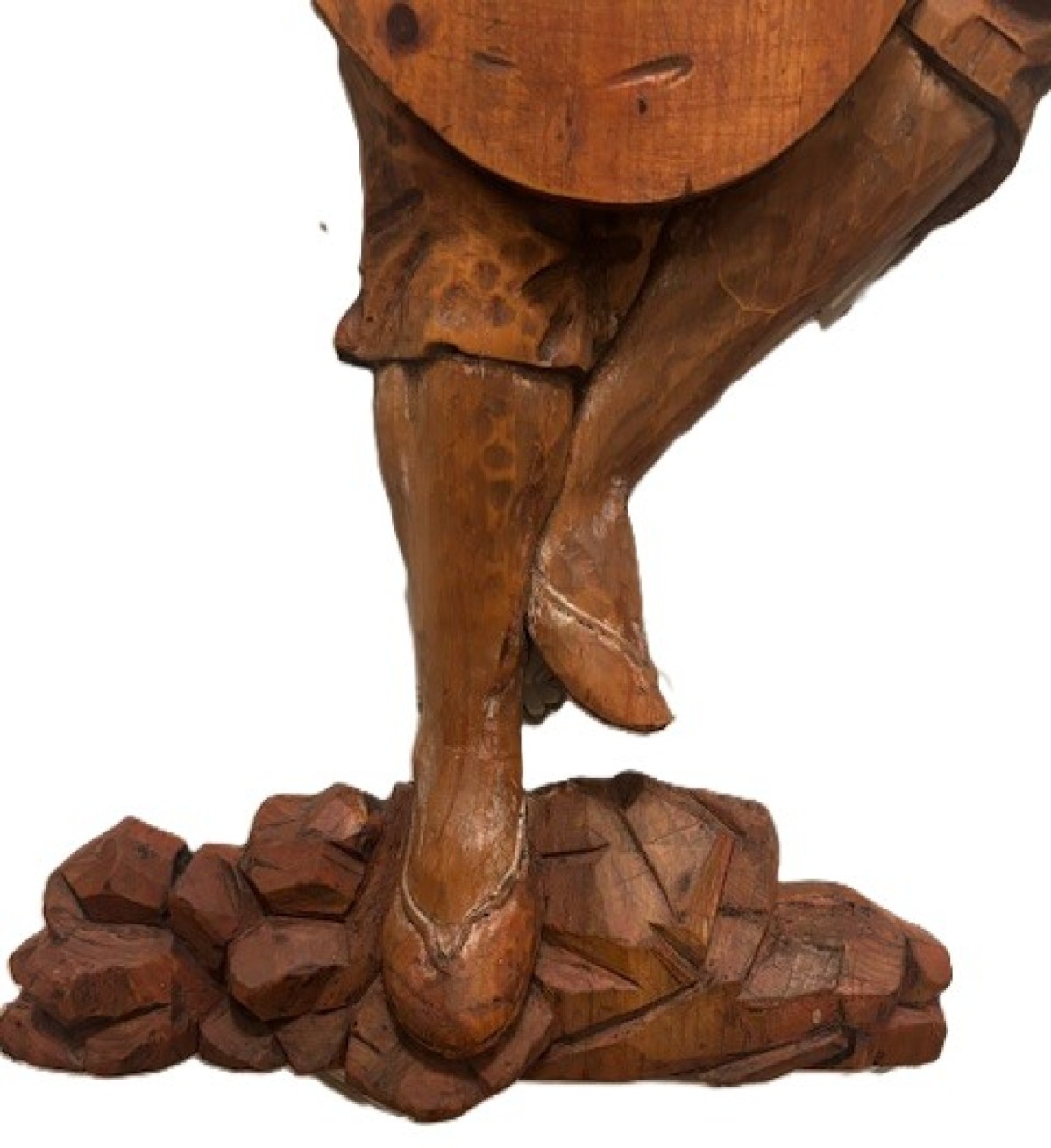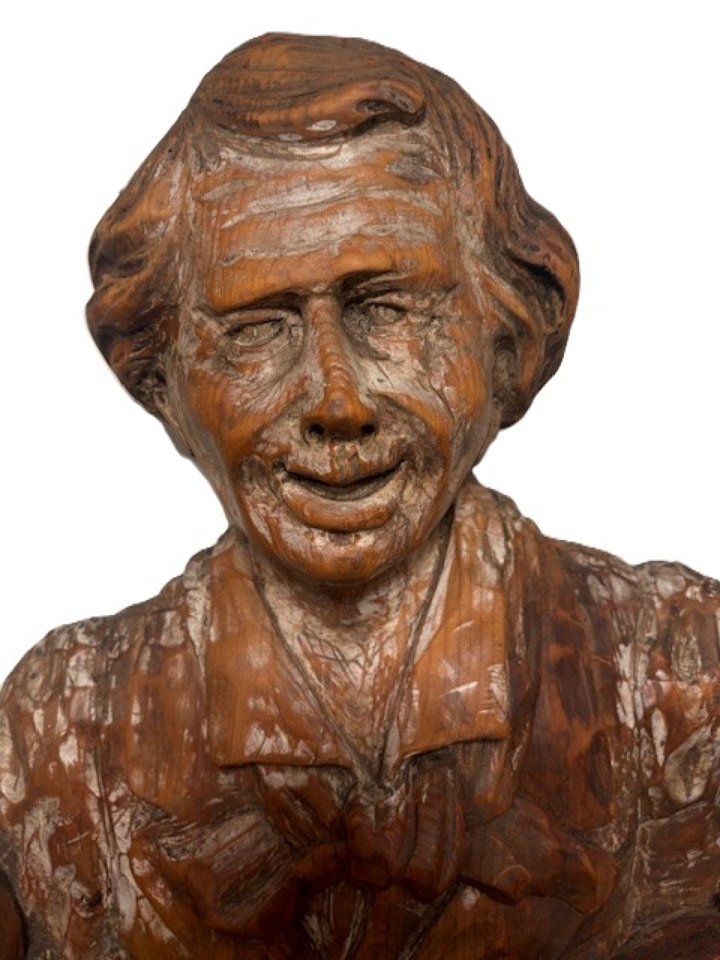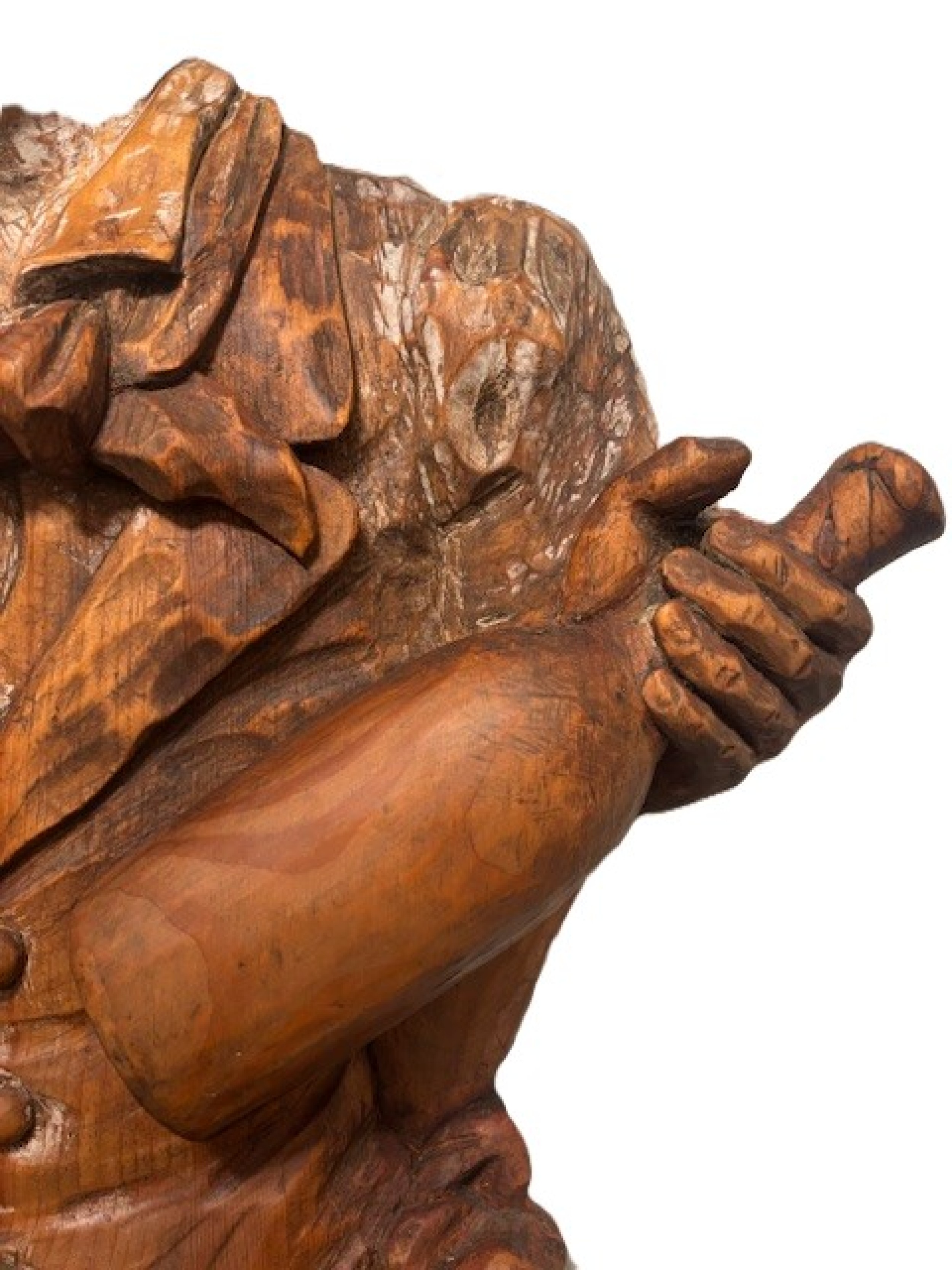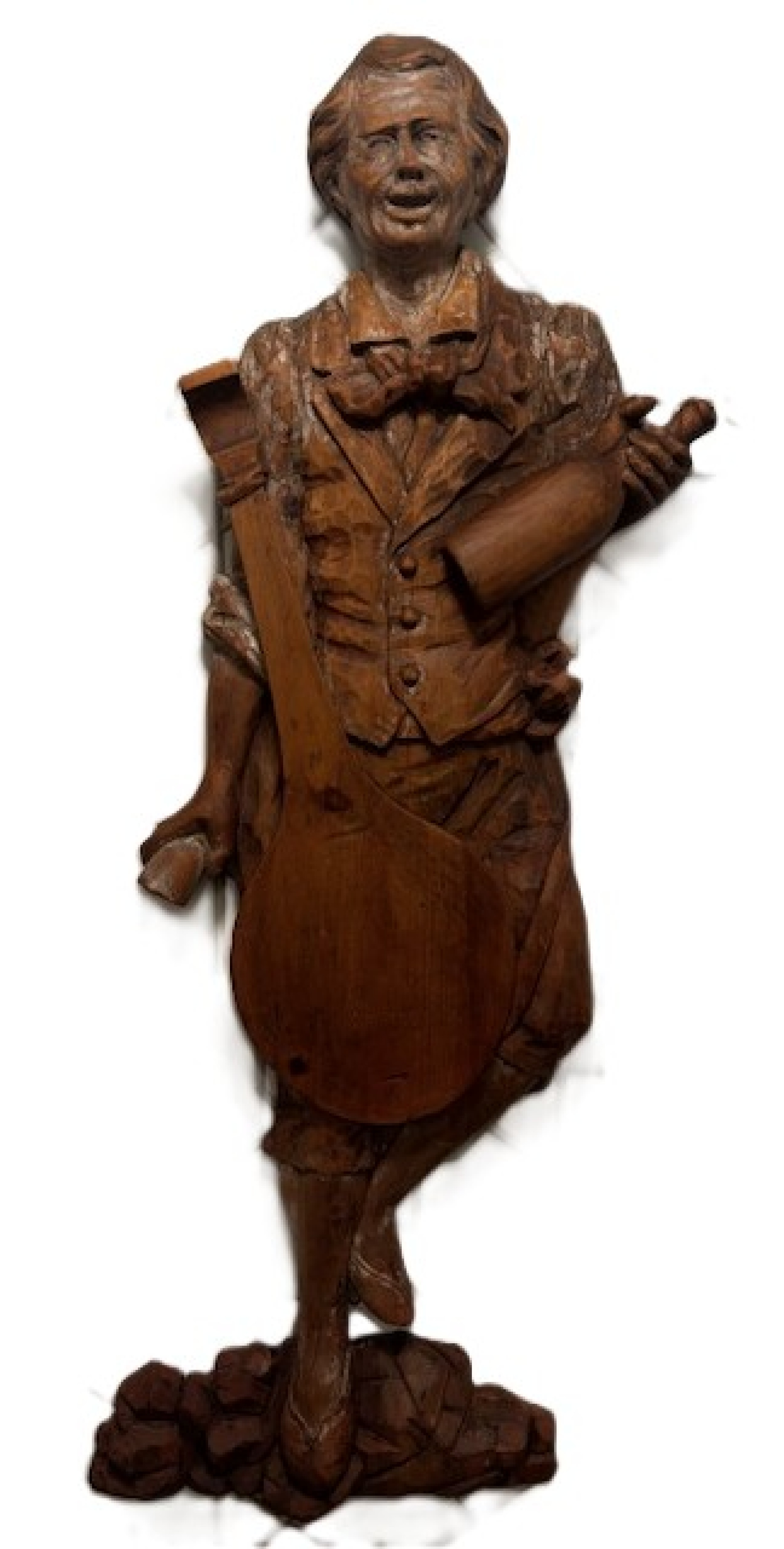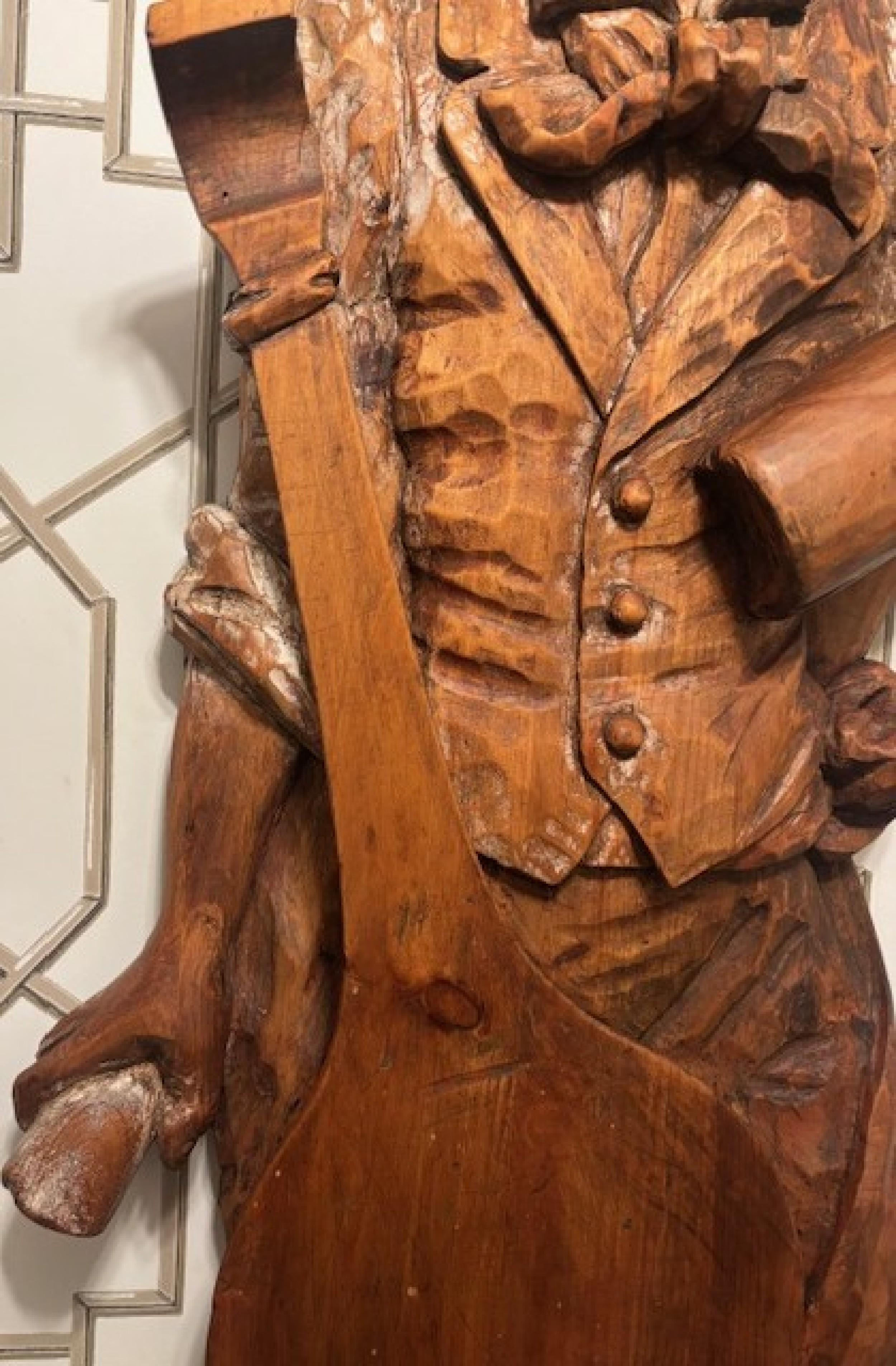 American Folk Art stripped pine wall plaque of a 19th Century musician holding a bottle and glass with a guitar draped in front (BOSTON CARVING RTISTIC CARVING COMPANY-1st half 20th Century)