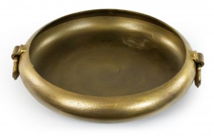 2 brass painted metal shallow round planters with textured handles. (PRICED EACH).