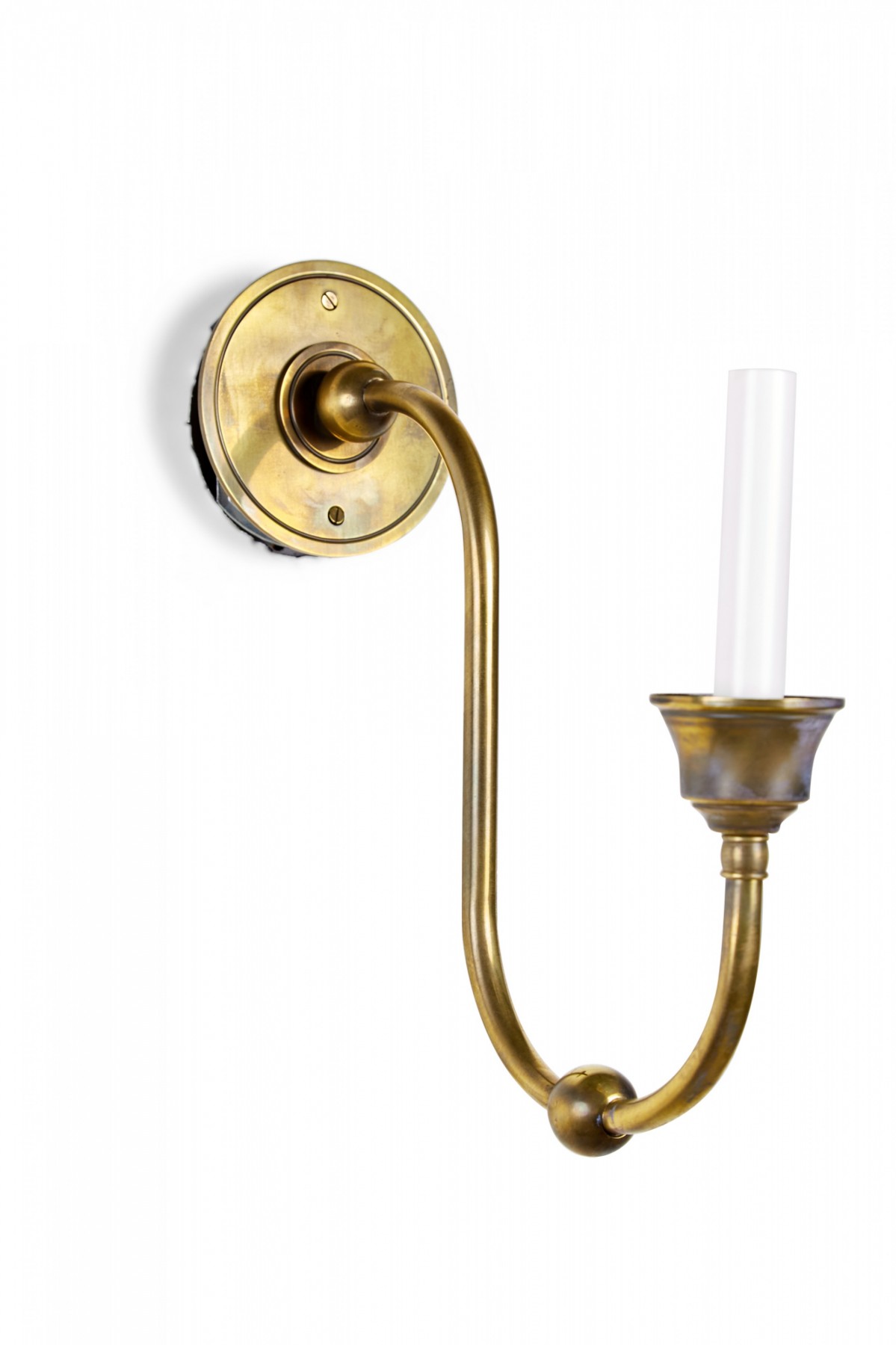 Contemporary antiqued brass wall sconce with hurricane globe shade.