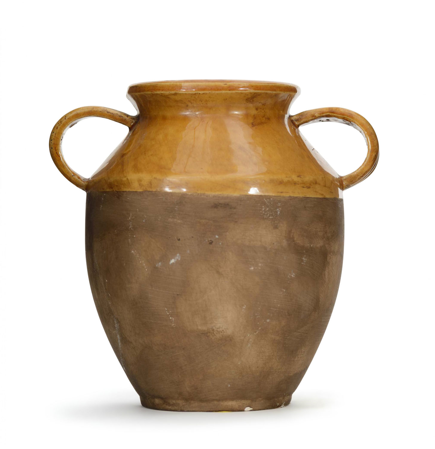 Jug-shaped brown ceramic vase with ribbed handles and ochre-colored glaze on top third