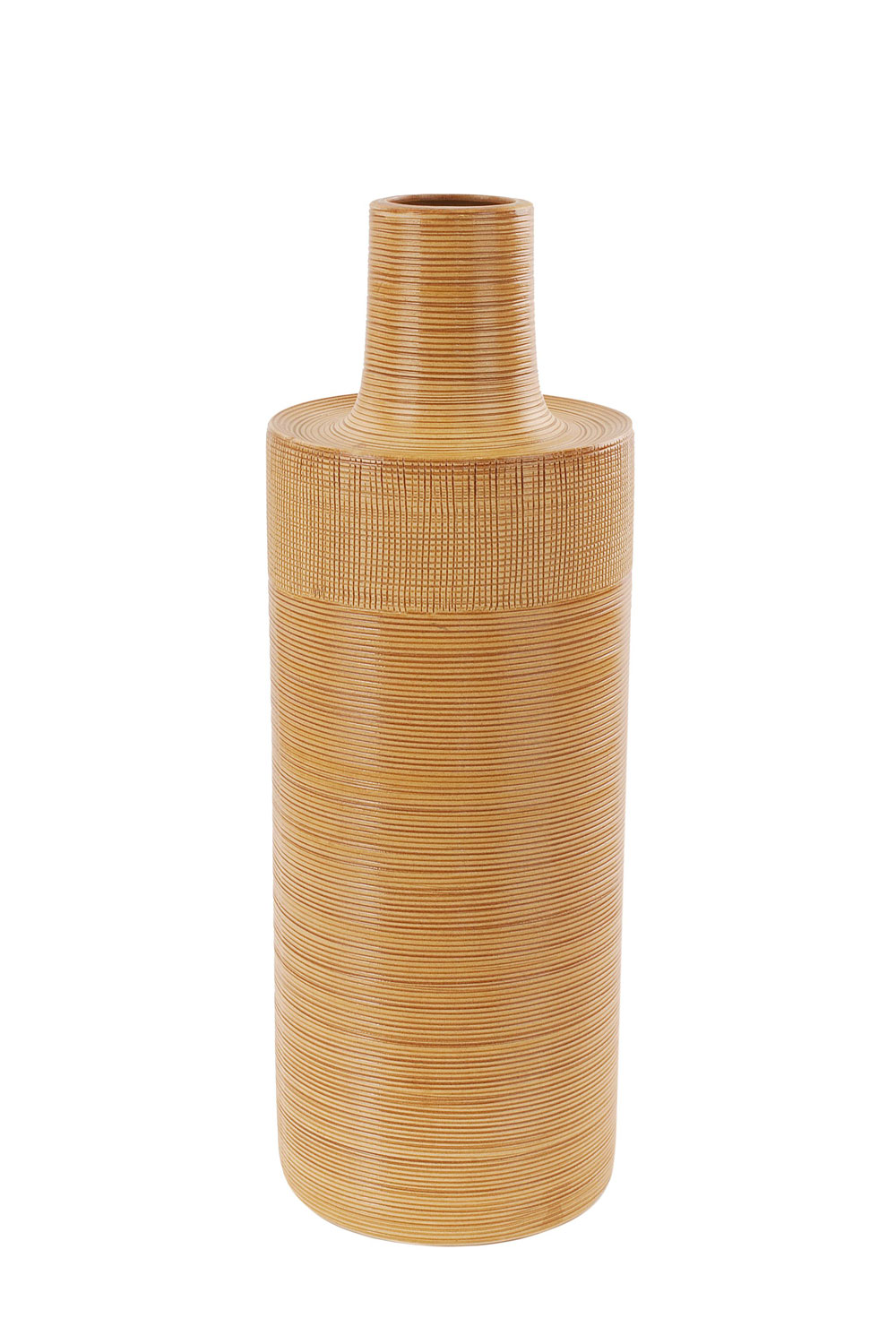 Cylindrical gold and brown ceramic vase with an engraved horizontal ribbed pattern around the body, a cross hatched pattern around the top portion, and a ribbed and slightly tapered circular mouth