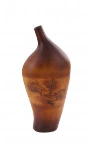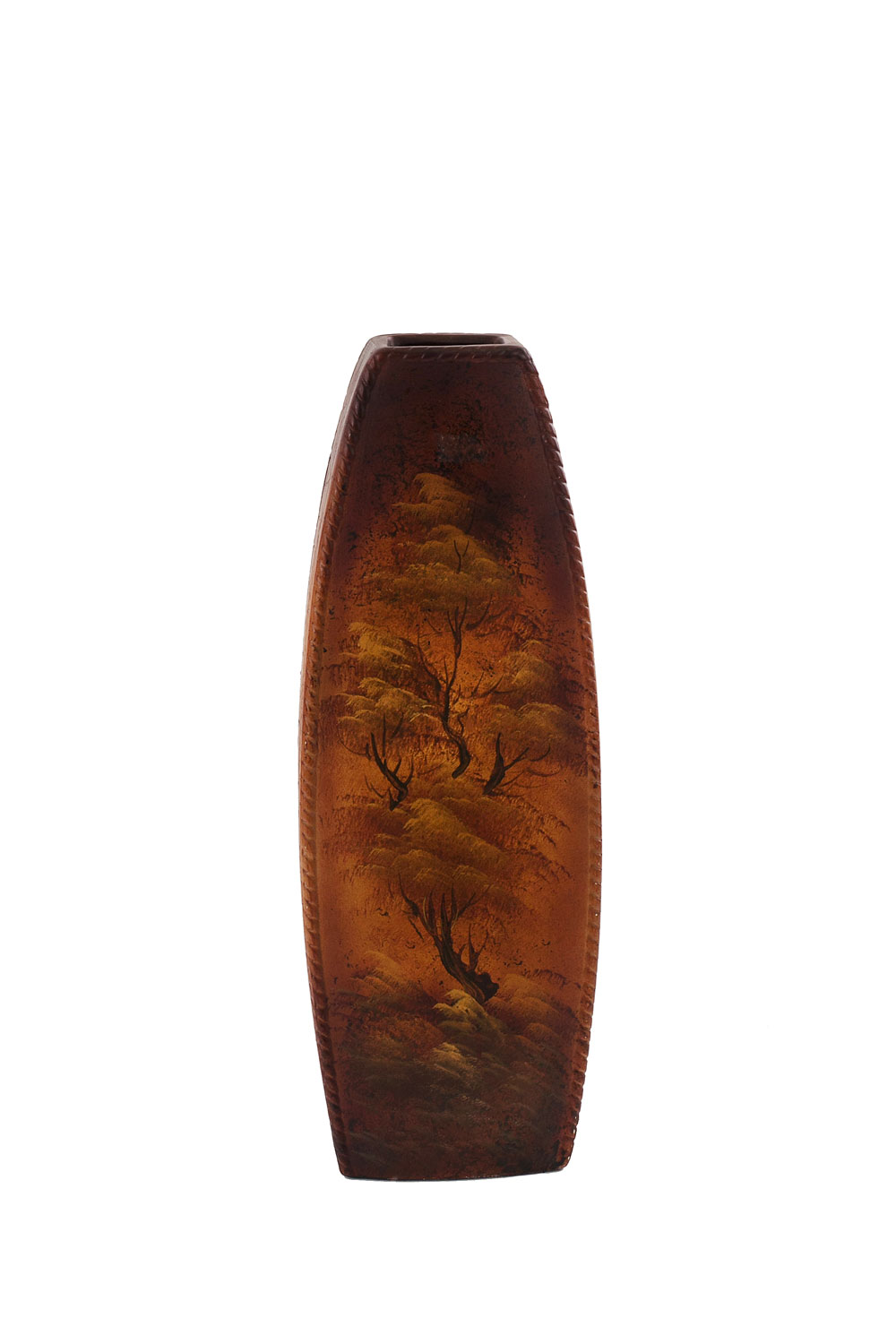 Rectangular ceramic vase with bowed rounded edges, a brown, red, and orange ombre paint treatment, painted brown trees on the wide sides, and a crackle treatment on the shorter sides (Similar vase: BIN061)