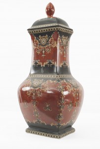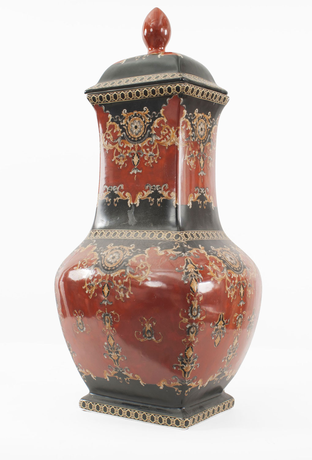 Large ceramic jar with a lid having a final top and having a black, dark red, and gold decorative pattern