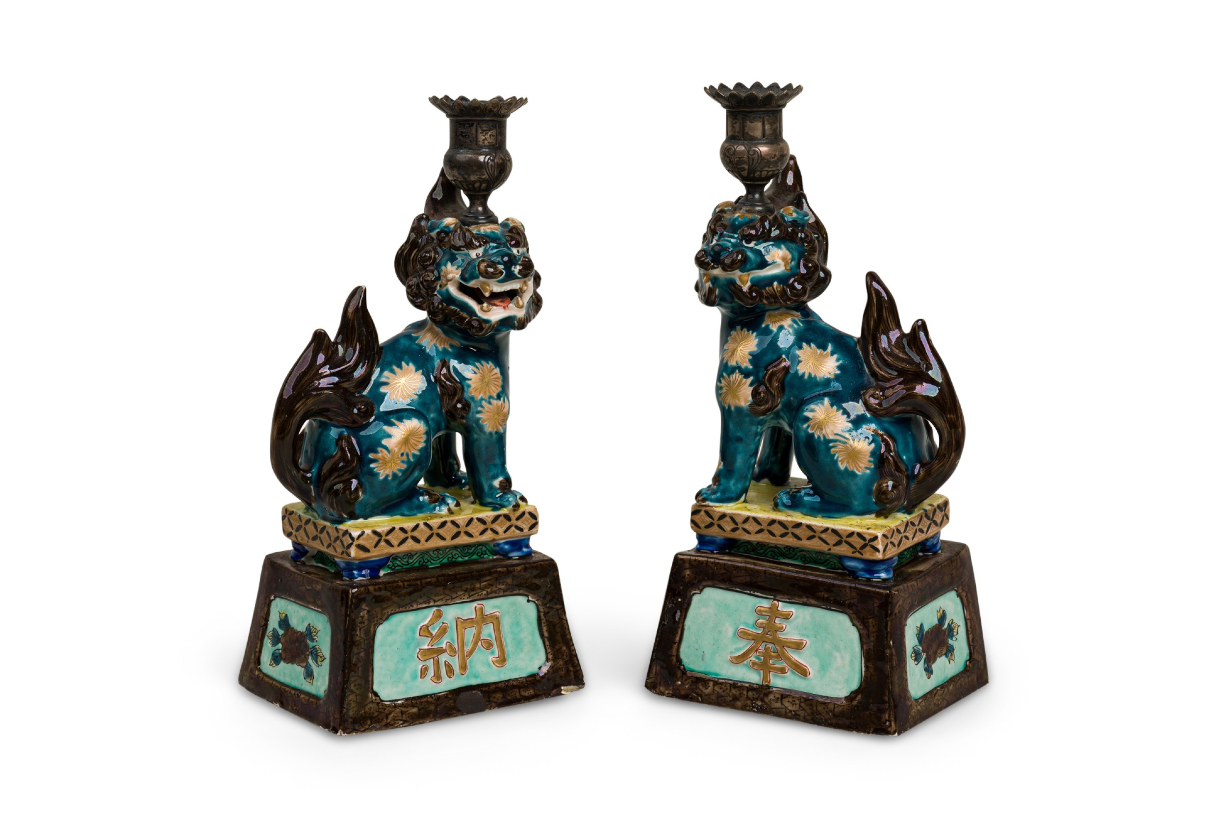 PAIR of Asian Chinese style decorative blue-painted porcelain Foo Dog figures with brown floral decoration having silver candlesticks over their heads and seated on stepped plinths with Chinese inscriptions (PRICED AS PAIR)